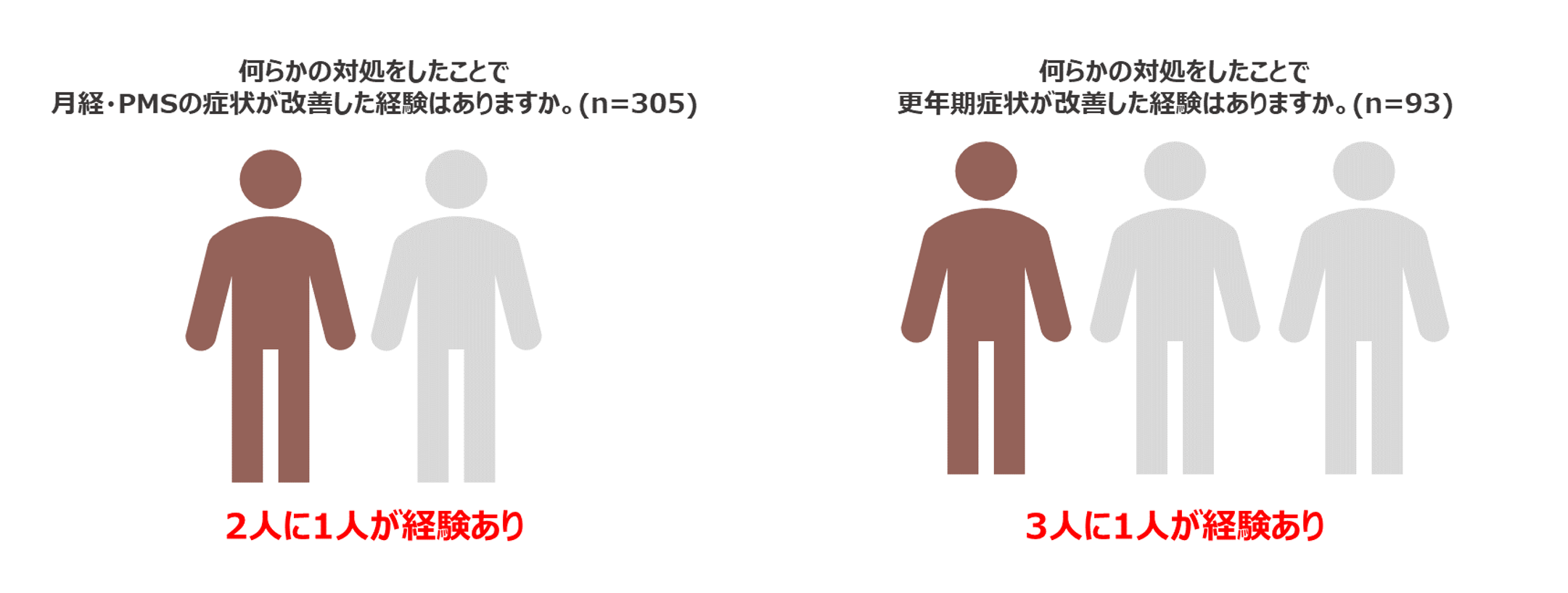 月経・PMSでからだの痛みやメンタルに影響があると答えた人のうち、「何らかの対処をしたことで症状が改善した経験がある」という人は49.5%でした。また、更年期症状を自覚する人のうち、35.5%は「何らかの対処をしたことで症状が改善した経験がある」と回答しました。