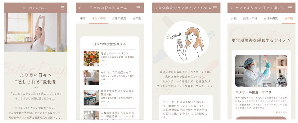 7月31日より提供を開始する、企業の女性活躍推進を健康面で支援する新サービス「HELPO acito+」(https://healthcare-tech.co.jp/news/20230731_2.html)は、ヘルスケアアプリ「HELPO」を導入する企業に無償で提供されるサービスです。「HELPO actio+」は下記のような特長を携えています。