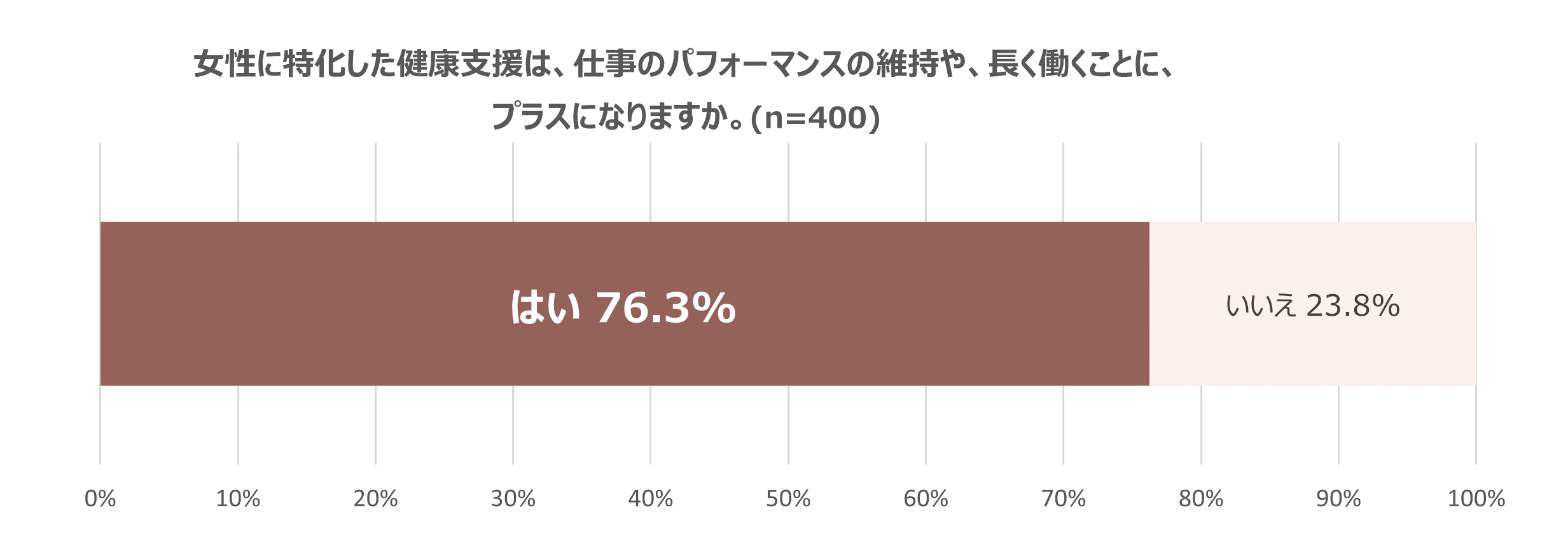 女性に対し「女性に特化した健康支援は、仕事のパフォーマンスの維持や、長く働くことに、プラスになりますか」と聞いたところ、76.3%が「はい」と回答しました。