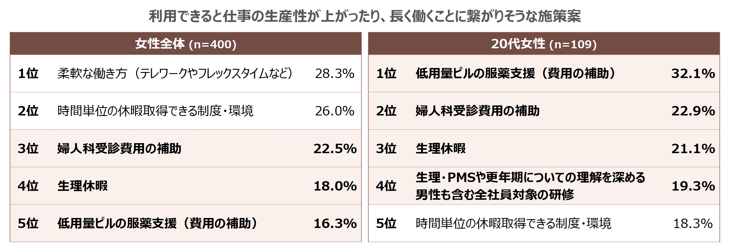 加えて、「利用できると仕事の生産性が上がったり、長く働くことにつながりそうな施策」を聞いたところ、1位「柔軟な働き方(テレワークやフレックスタイムなど)」(28.3%)、2位「時間単位の休暇取得できる制度・環境」(26.0%)と働き方の面での制度が上位に来る一方で、3位以降は「婦人科受診費用の補助」(22.5%)、「生理休暇」(18.0%)、「低用量ピルの服薬支援(費用の補助)」(16.3%)と健康支援の施策が続きました。20代の結果はより健康支援の傾向が強く、1位「低用量ピルの服薬支援(費用の補助)」(32.1%)、2位「婦人科受診費用の補助」(22.9%)、3位「生理休暇」(21.1%)、4位「生理・PMSや更年期についての理解を深める男性も含む全社員対象の研修」(19.3%)、5位「時間単位の休暇取得できる制度・環境」(18.3%)という結果でした。