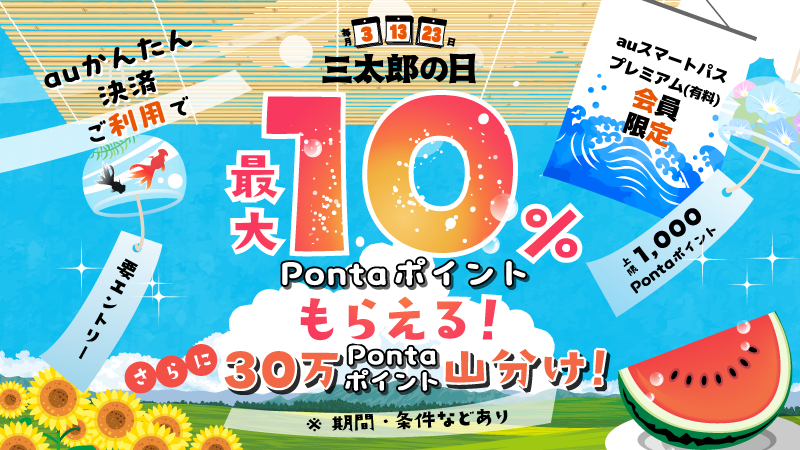 8月は三太郎の日のご利用金額に応じたPontaポイント還元(3日間の通算お支払い金額に応じて最大10%Pontaポイント還元)に加えて、3日間合計で30,000円以上ご利用の方への30万Pontaポイント山分けも引き続き実施します。三太郎の日は、毎月3・13・23日に開催するおトクな3日間で、auスマートパスプレミアム会員は特におトクな特典が受けられます。本キャンペーンは、2023年8月3日の三太郎の日から対象です。auかんたん決済は、Amazon.co.jpやDMM.comでのショッピングをはじめ、コミックシーモア、めちゃコミックでの電子書籍のご購入など、多くのお店でご利用頂ける便利なオンライン決済サービスです。