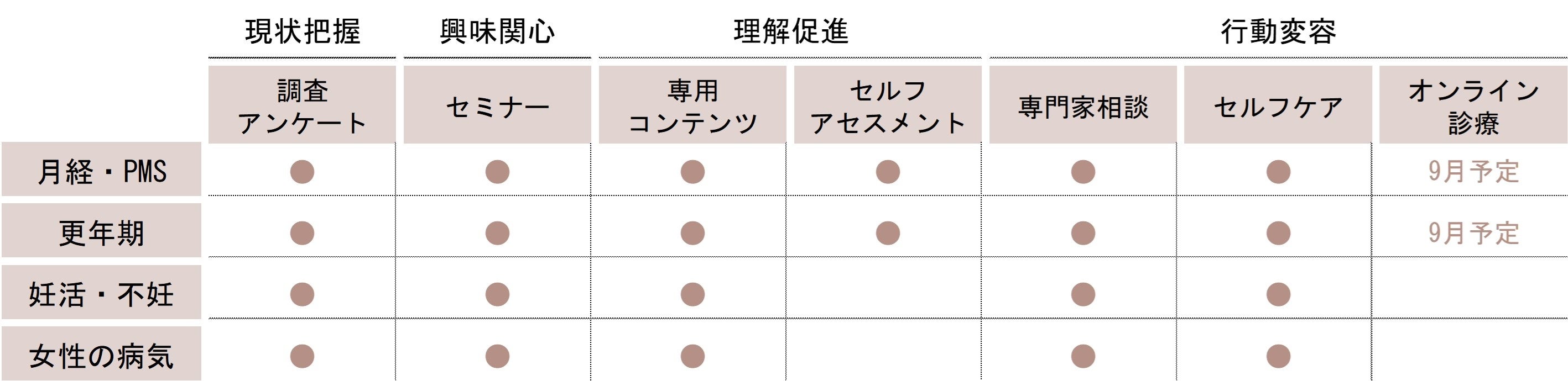 働く世代に関わる4大カテゴリである「月経・PMS」「更年期」「妊活・不妊」に加え、業界初の取り組みとして、女性に多い“なんとなく不調”という症状や先のトピックスに当てはまらない症状を含む「女性の病気」に関わる領域までサポート