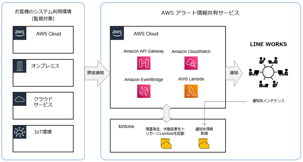 システムや設備などの監視対象から障害通知を収集し、AWSを介してkintoneに保存。さらに即時にLINE WORKSへ通知し、障害情報などを共有する仕組みです。設備監視のほかに災害情報の共有などにも利用可能です。