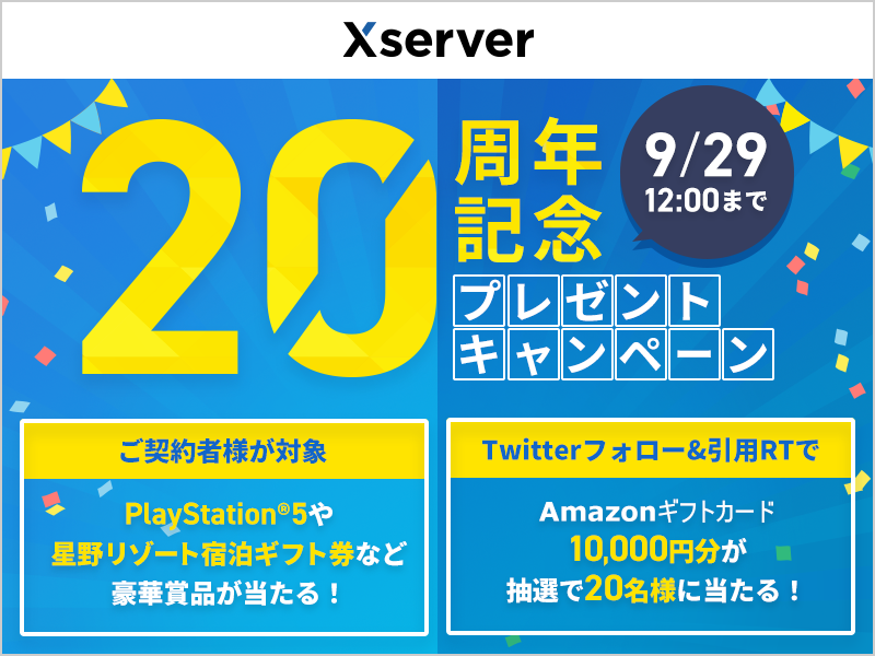 既存のご契約者様や新規ご契約者様を対象に、「PlayStation®5」や「Nintendo Switch(有機ELモデル)」「星野リゾート宿泊ギフト券5万円分」「Amazonギフトカード5万円分」などの豪華賞品が、抽選で2,555名様に当たる「20周年記念プレゼントキャンペーン」と、『エックスサーバー』の公式アカウントをフォローして対象の投稿をリツイートすると、抽選で「Amazonギフトカード1万円分」が当たる「20周年ありがとうTwitterキャンペーン」を実施中です。