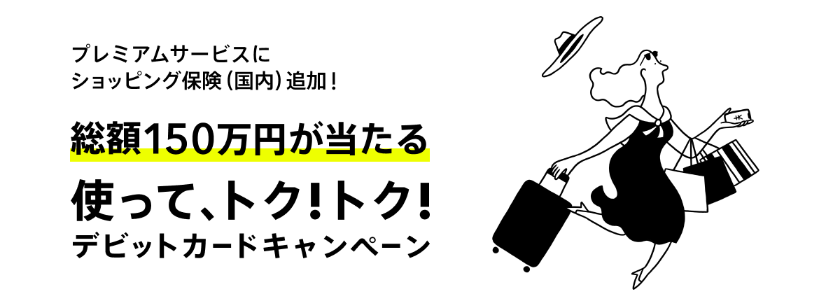 月間のデビットカード決済金額合計1万円以上をご利用いただいたプレミアムサービス利用者の方の中から、抽選で毎月50名(期間合計150名)に1万円が当たります ■特典獲得条件 ①月間のデビットカード決済金額が合計1万円以上であること ②キャンペーン期間中の毎月月末時点でプレミアムサービスに加入していること ■留意事項 •決済額1万円で1口、月々最大10口とします •月末時点でプレミアムサービスに加入していれば、当月のプレミアムサービス加入前のデビットカード決済金額も合算対象となります |