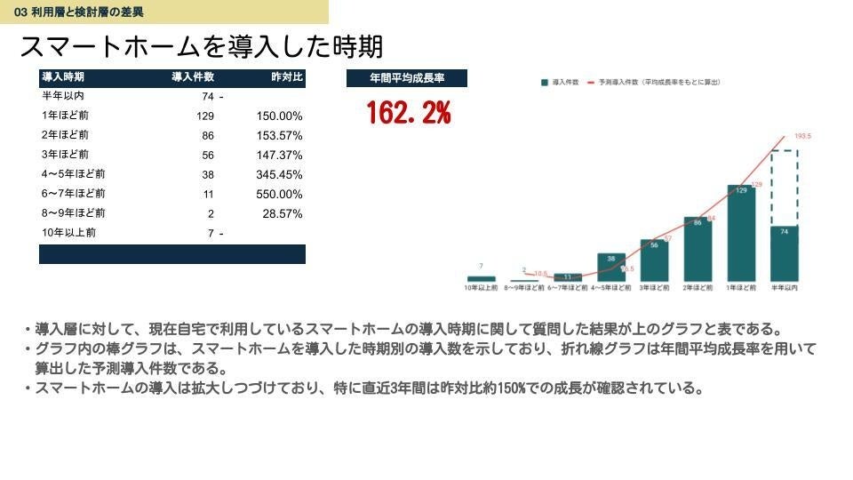 スマートホームを導入済みの一般消費者に、「初めてスマートホーム機器を導入した時期」を調査した結果、直近3年間で150%の増加率であったことがわかりました。スマートホームの認知拡大に連動して、導入に踏み出すユーザーも増加していることが伺えます。