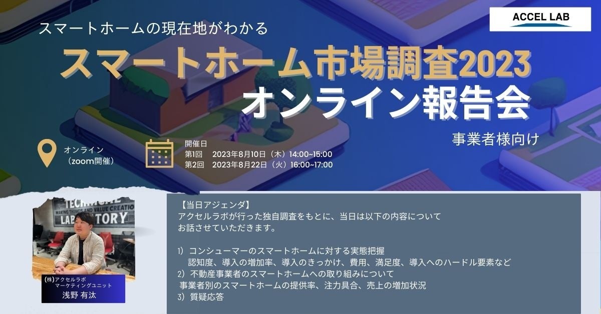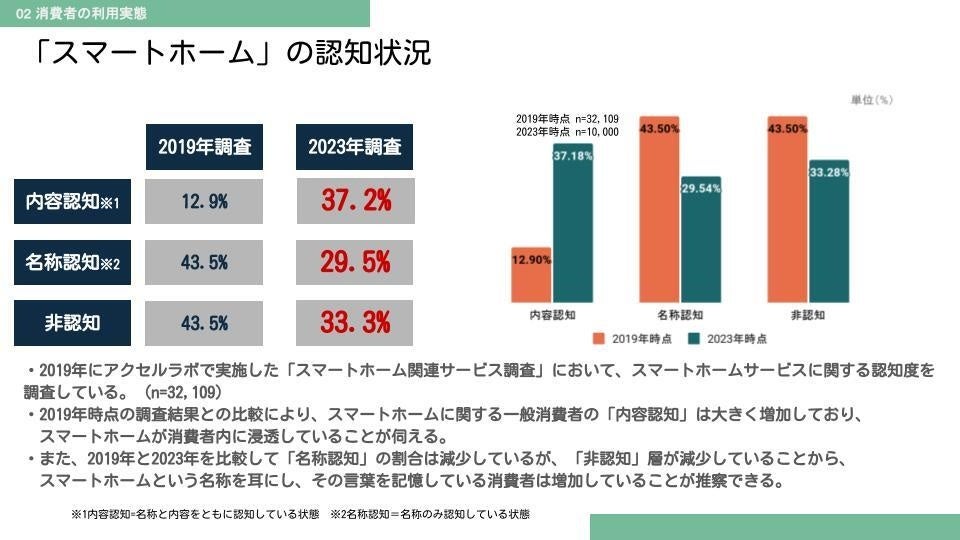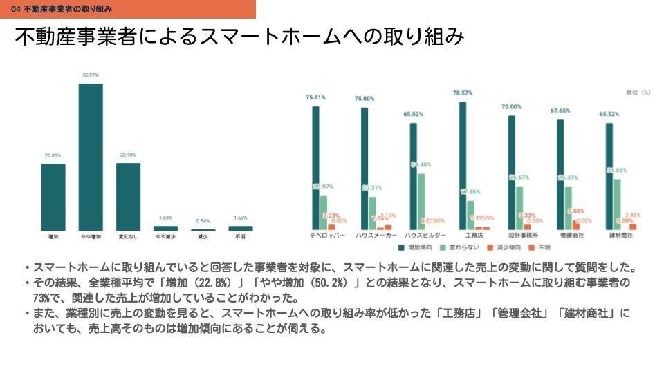 【不動産事業者調査】 ・45%(n=825)の企業がスマートホームのサービス導入に取り組んでいる。 ・73%(n=825)の企業が年間のスマートホーム関連の売り上げが増加傾向にある。 【コンシューマー調査】 ・スマートホームの認知率は67% ・スマートホームの導入は直近3年間で平均150%ずつ増加 |