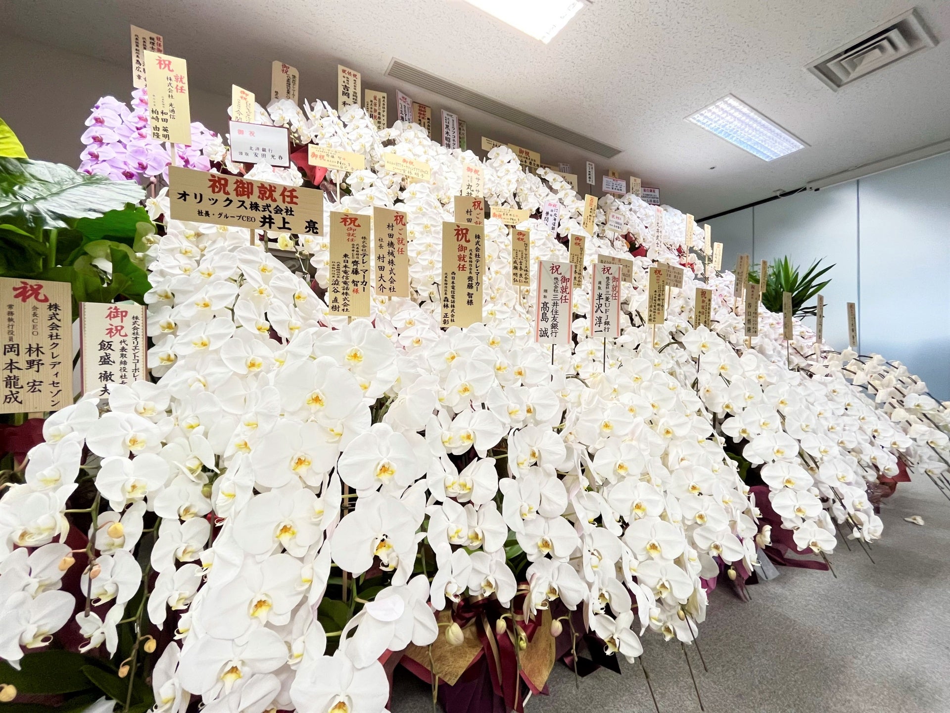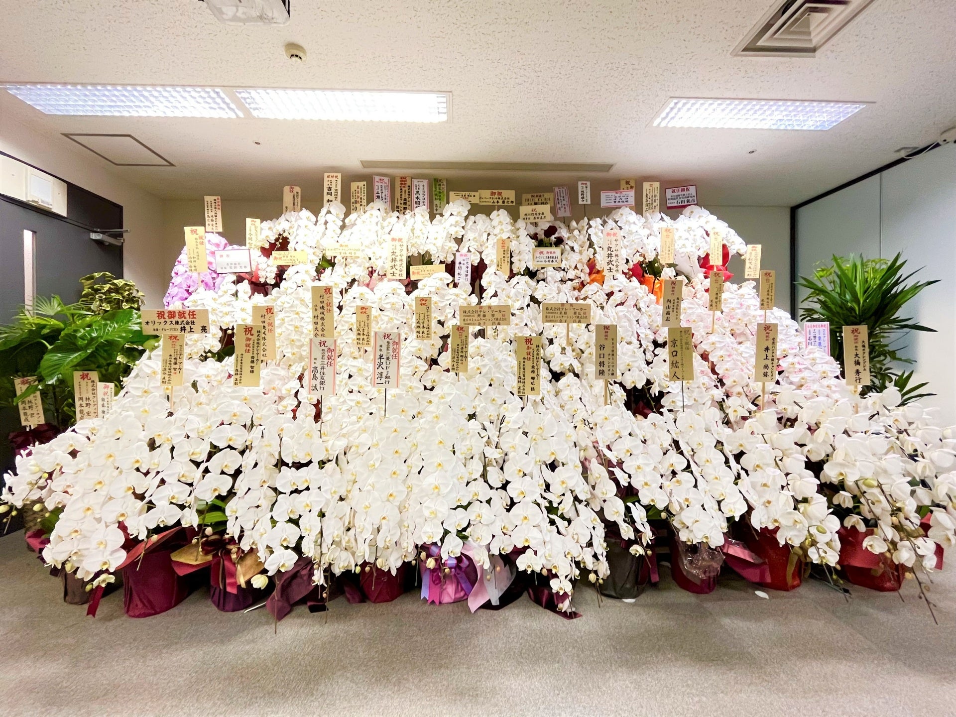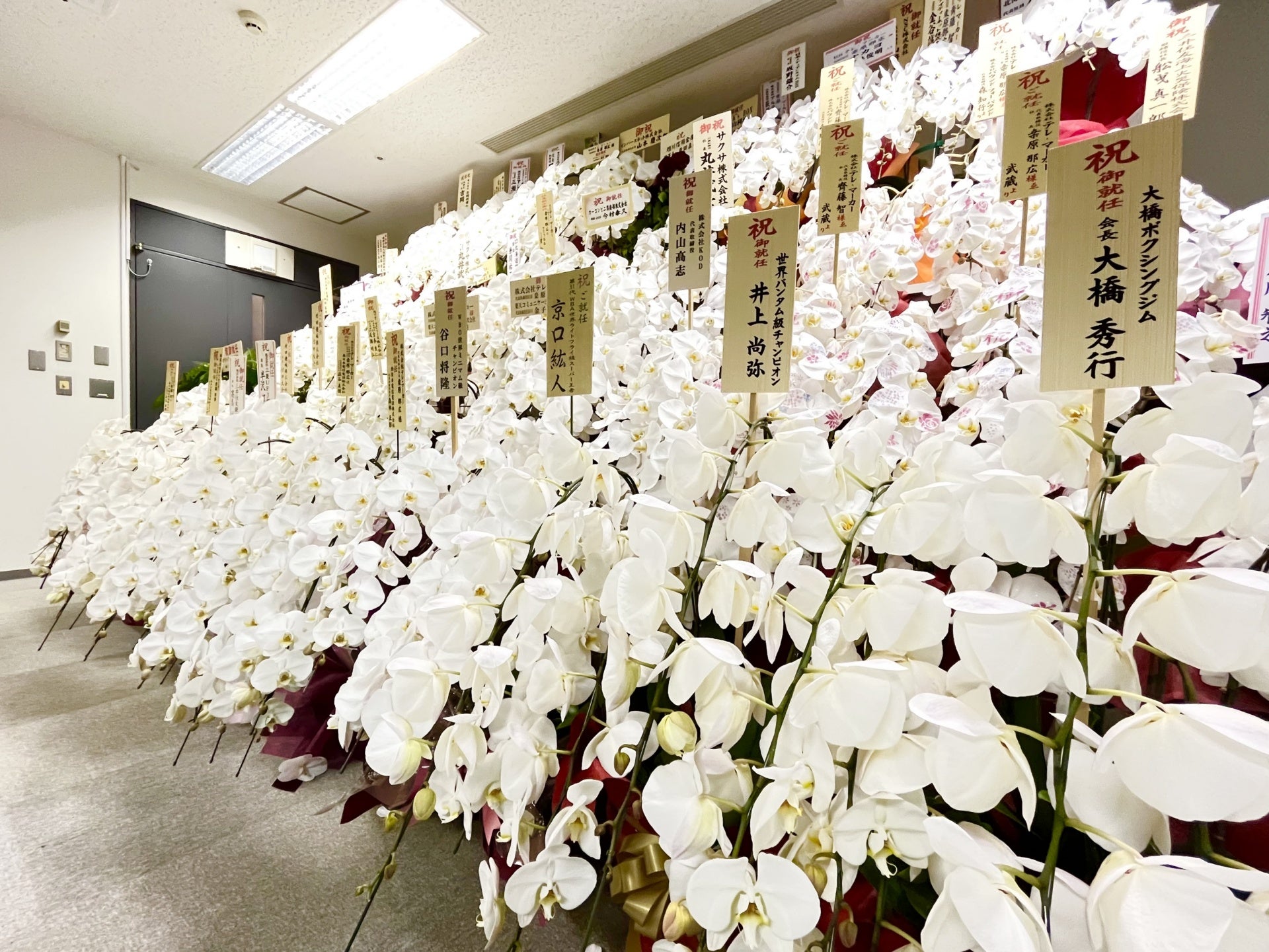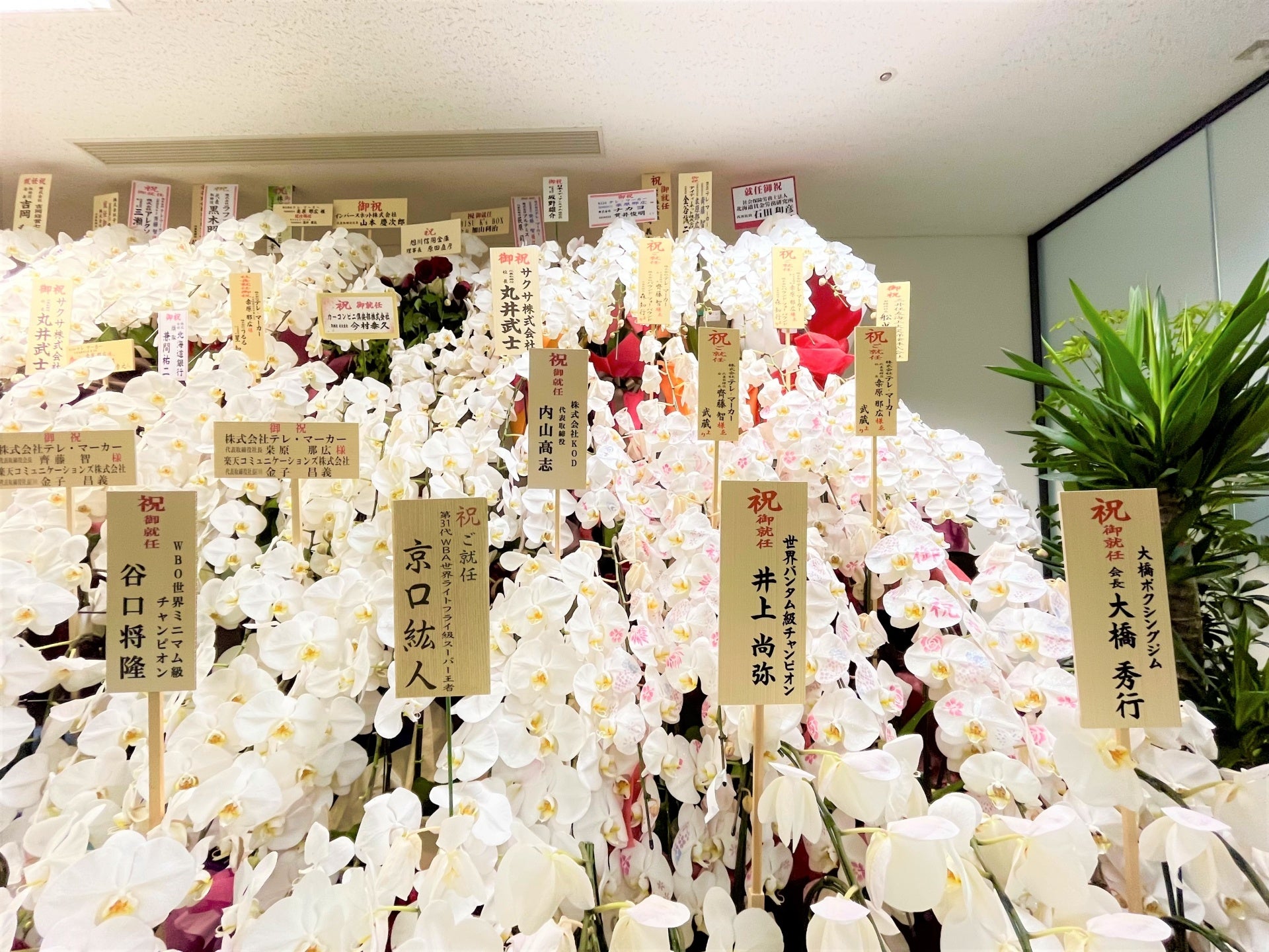齊藤代表取締役会長兼CEO、桜井取締役副会長、桒原代表取締役社長兼COOの就任に際し、各界企業の皆様や当社が活動を支援させていただいているスポーツ業界の名だたる方々より祝花を頂戴しております。