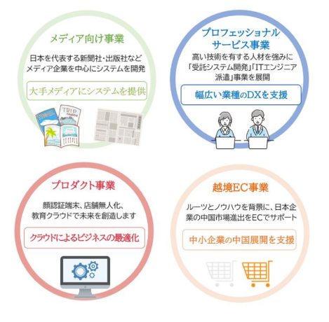 HOUSEIは、DXを実現するパートナーとして、「メディア向け事業・プロフェッショナルサービス事業・プロダクト事業・越境事業」の4つの事業を柱に、日本のDX化を図ります。