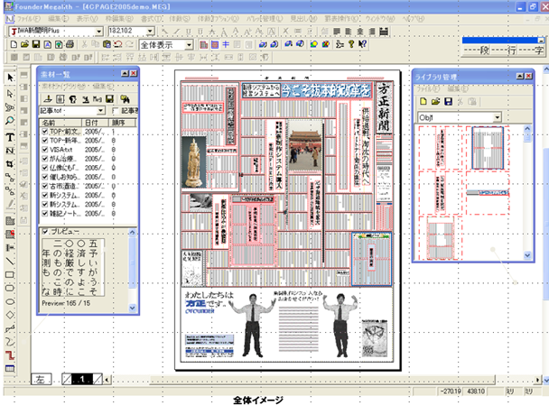 Megalith(メガリス)はWindowsDTPソフトで、新聞制作の特徴である記事の流しや見出し、箱組などの操作性を重視した多機能アプリです。専門の知識がなくても習得しやすいインターフェイスで、広告面のような自由度の高い紙面の表現やカラー紙面対応も行えます。仕上がり状態を画面で確認(WYSIWYG)しながらの会話型組版となっています。