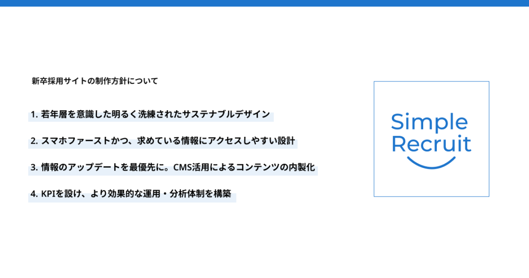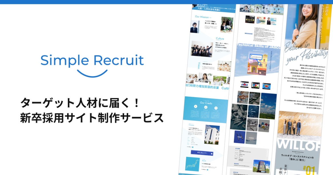『Simple Recruit』は、こういった採用に関する悩みを解決する、新卒採用に特化した採用サイト作成を手がけます。