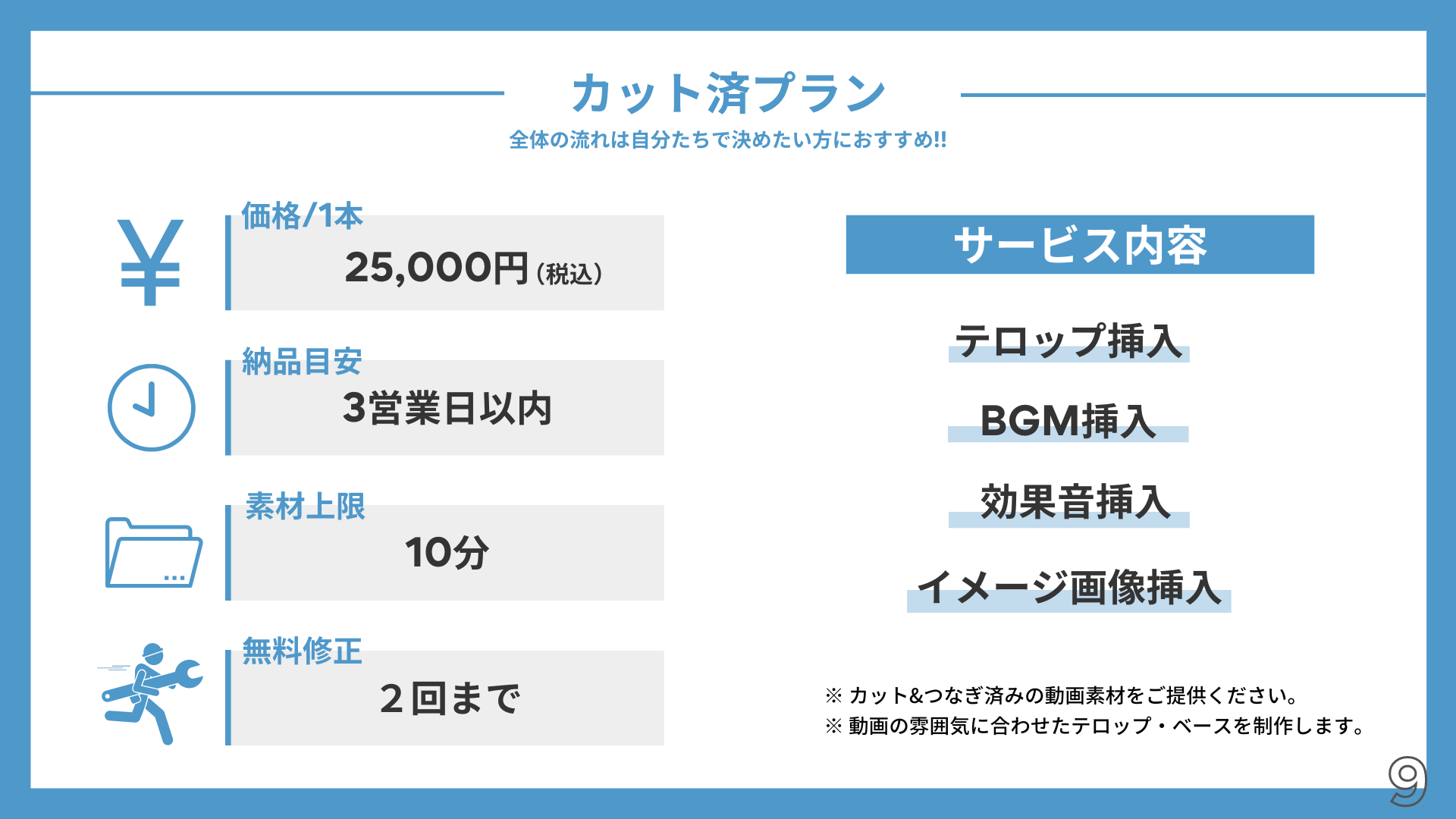 【初回お試しキャンペーン 概要】 ■キャンペーン実施期間 ・2023年8月1日(火)〜2023年9月30日(土) ■キャンペーン対象 ・カット済みプラン 25,000円→12,500円(税込) ・素材丸投げプラン 36,000円→18,000円(税込) ■対象本数 ・2本まで(※無料修正対応は各1回) ■お問い合わせURL お問い合わせ | 株式会社2plus 株式会社2plusに関するお問い合わせは、こちらのフォームよりお願いします。 |