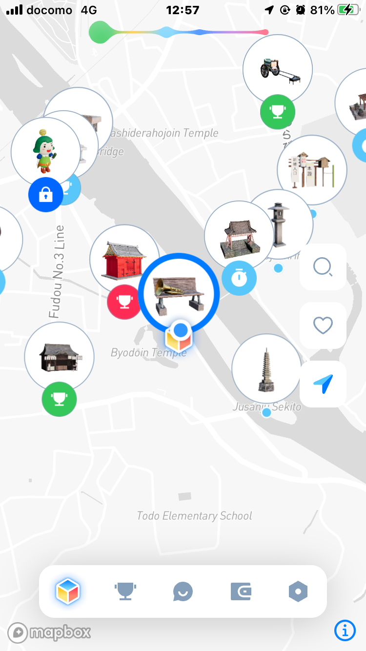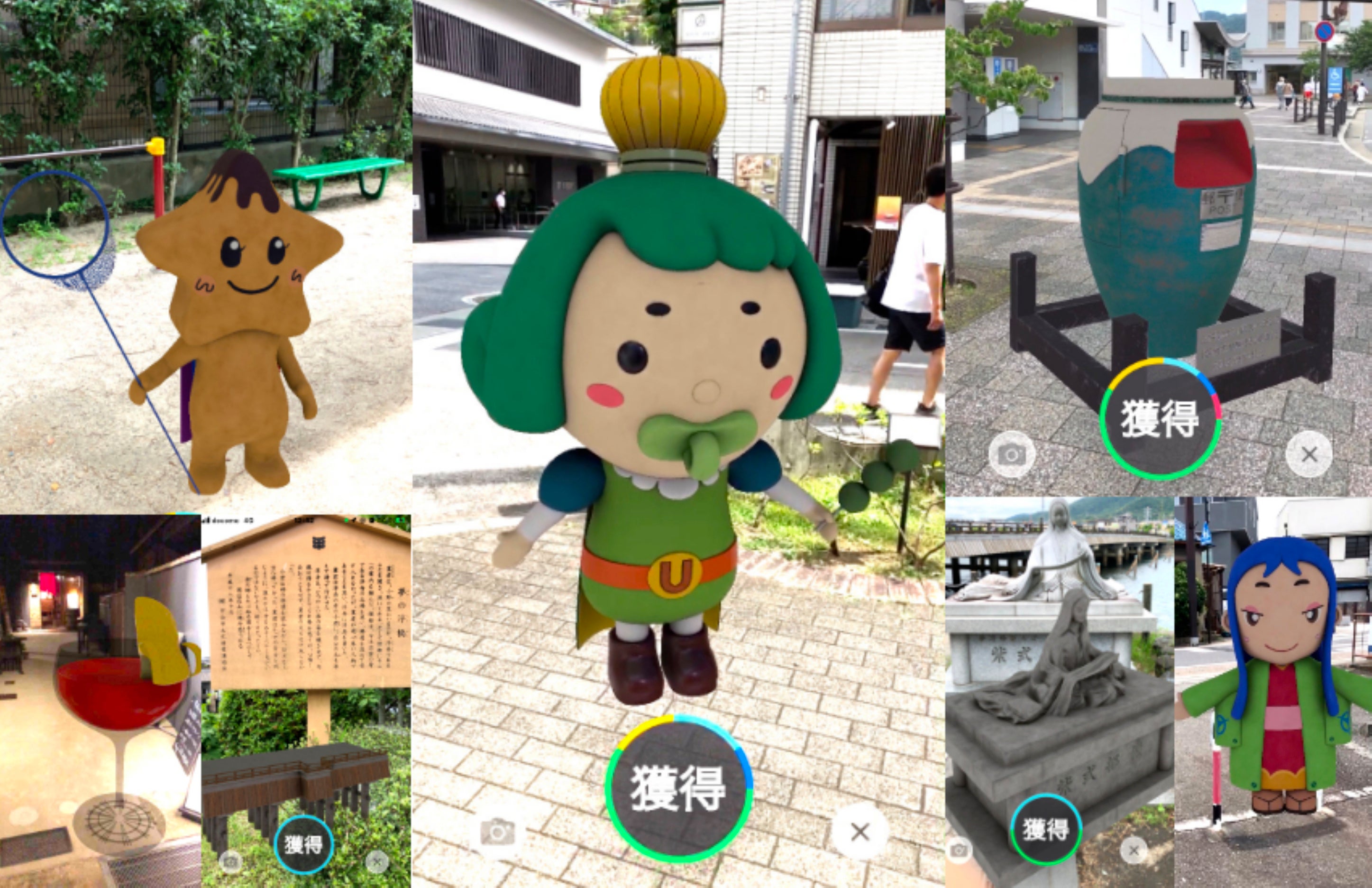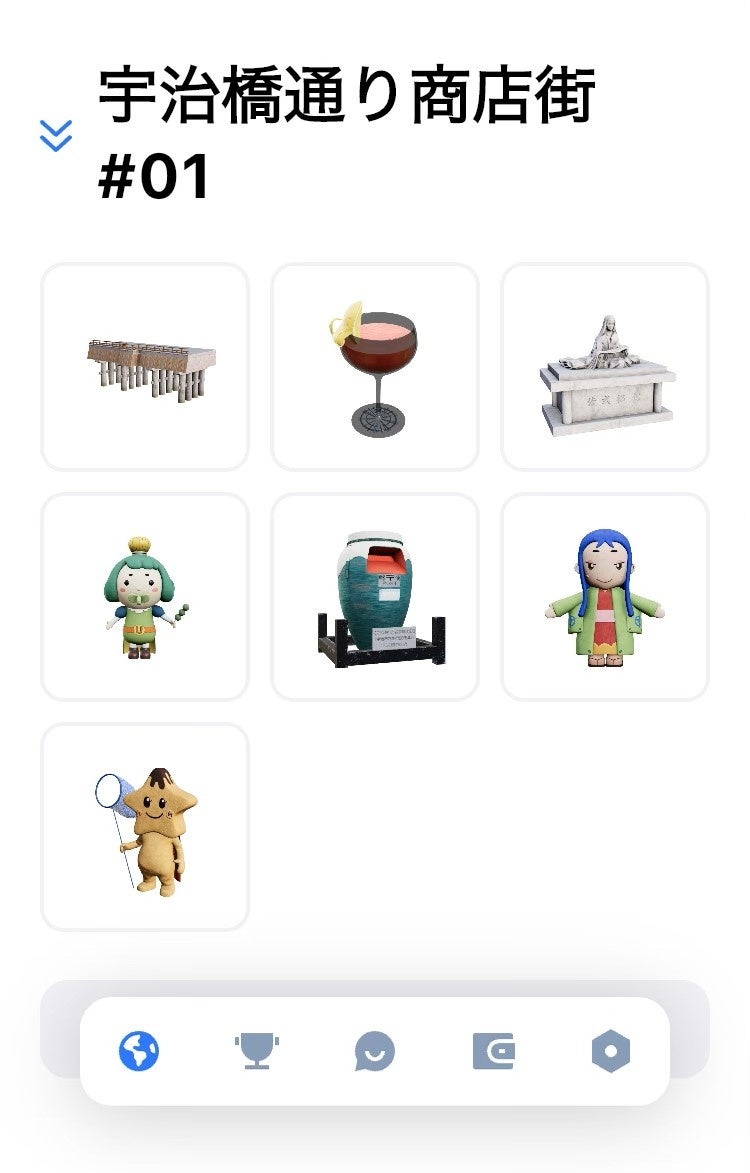6.「宇治橋通り商店街」コレクションの詳細が表示されて、ここで「獲得開始」ボタンをタップすると、コレクションなどの3Dデジタルデータが配置されています。現実世界でその場所に行くと、アプリ上でそのサイバートロフィーを獲得できる仕組みです。これによって、アプリユーザーを観光地や街のシンボル地点に誘導し、サイバートロフィーをコレクションとして集めることで様々な特典を付与することができます。