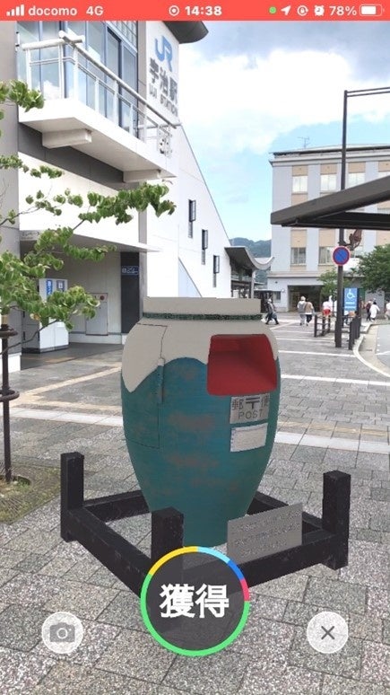 4.現実の場面の中に3Dのオブジェクトが浮かび上がります。獲得ボタンを押すと、ユーザーはオブジェクトを獲得し、アプリ内のトレジャールームに保管することができます。