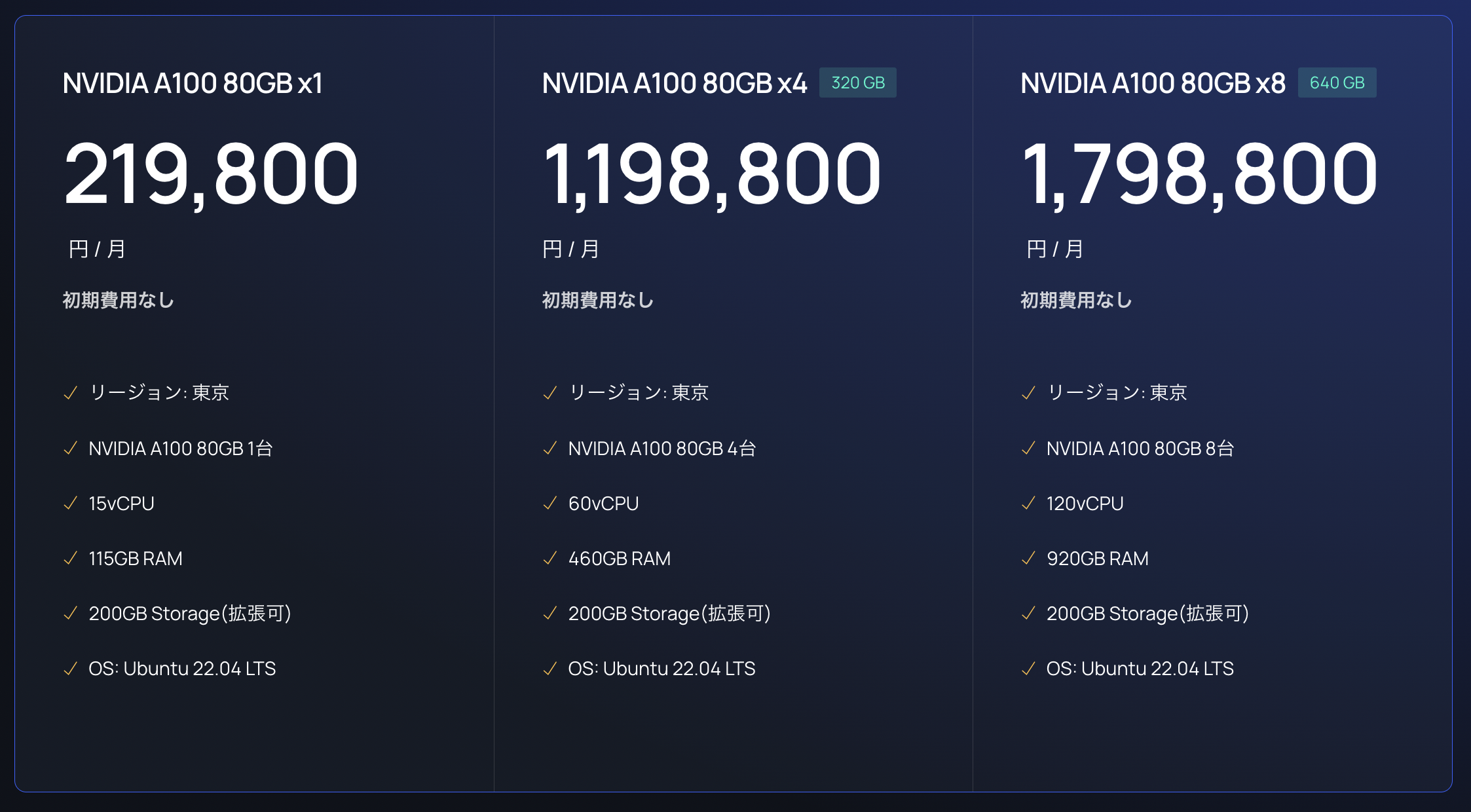 当社はこれまで2000社以上の法人様への「ChatGPT」を始めとした生成AIサービス提供の知見を活かし、高性能なGPUである「NVIDIA A100 80GB」搭載インスタンスの提供により、より高度なAIの利用とビジネスの進展をサポートします。