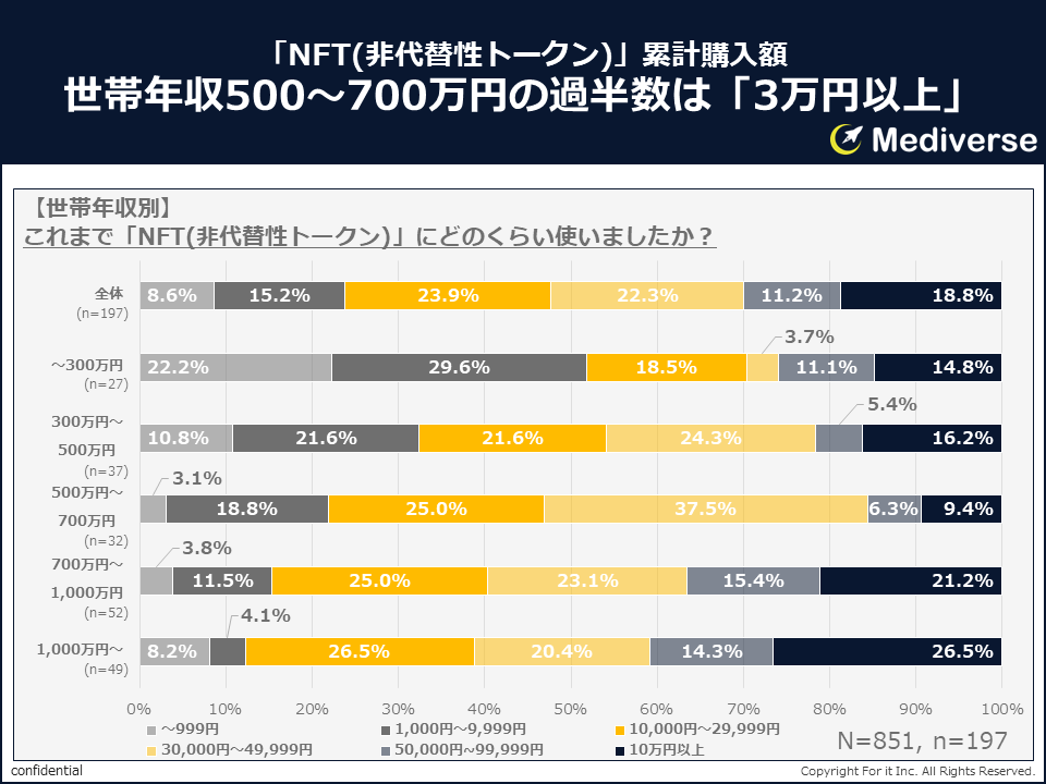 世帯年収別に見ると、「NFT(非代替性トークン)」の購入経験率は、世帯年収と見事に比例していた。300万円以下と1,000万円以上の世帯年収層には、購入経験率に3倍以上の差異が見られた。