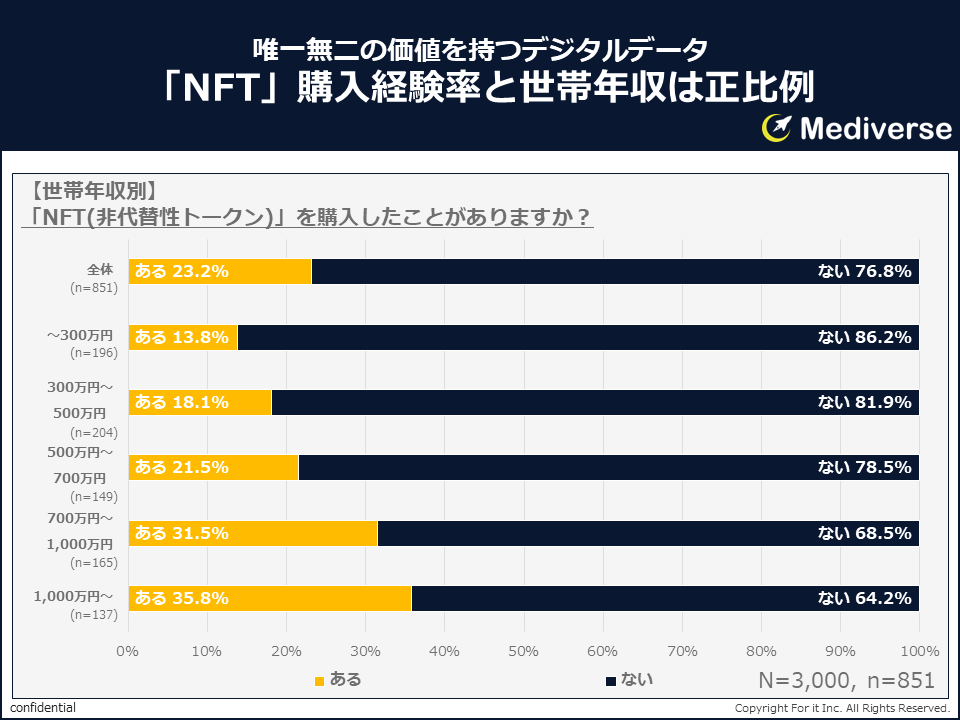 今回のアンケート調査結果では、「NFT(非代替性トークン)」の国内における認知度は3割程度であり、認知層の中で実際に購入したことがあるのは21.7%に留まっており、その購入経験の有無には、性別や年代よりも世帯年収が大きく影響していることが判明いたしました。