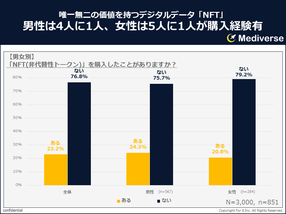 男女別に見ると、いずれも20%以上が「NFT(非代替性トークン)」の購入経験があるとのことで、先ほどの認知度と比較すると、購入経験の有無にはジェンダー差があまり見られないことがわかる。