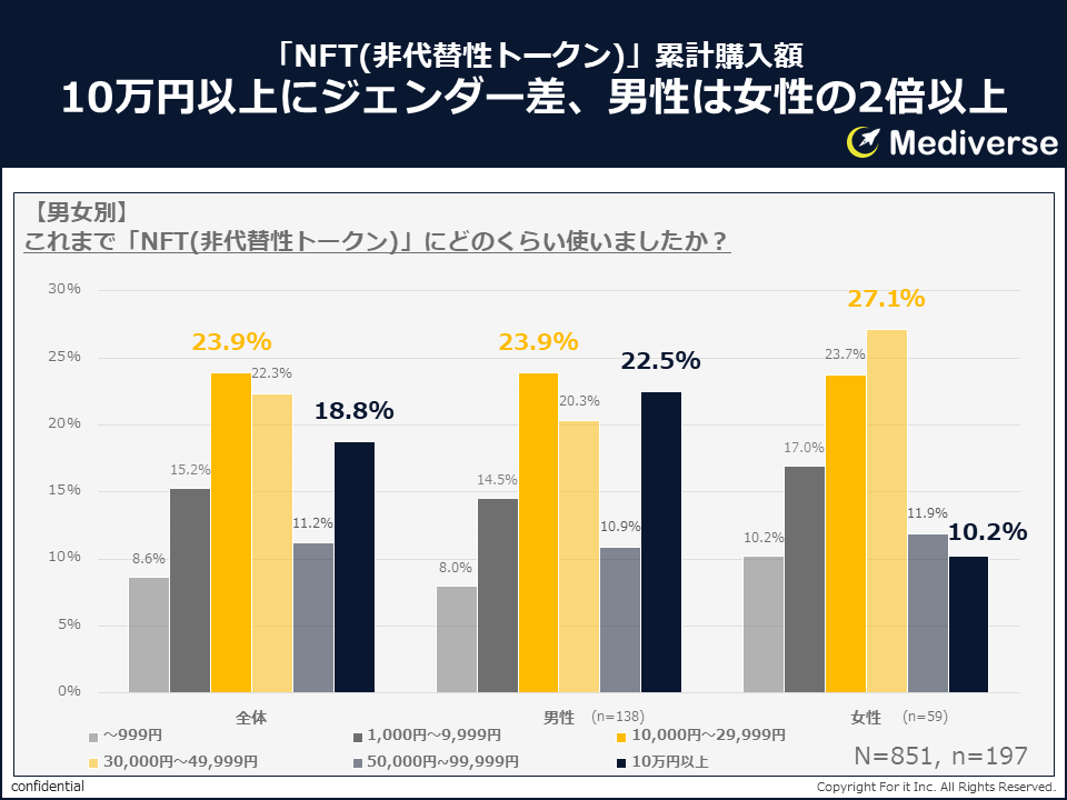 男女別に見ると、「NFT(非代替性トークン)」累計購入額にジェンダー差が顕著に見られたのは「10万円以上」で、男性は女性の2倍以上の割合であった。