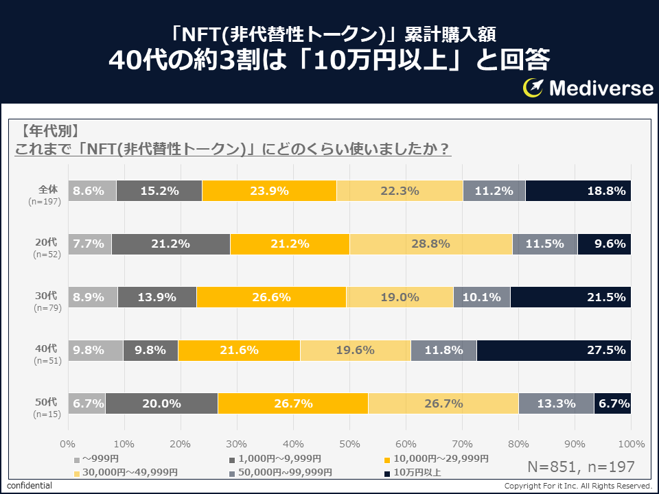 年代別に見ると、40代を除き、累計購入額は、「1万円以上」もしくは「3万円以上」が概ね半数を占めていた。かたや40代で首位をマークしていたのは、「10万円以上」27.5%で、「NFT(非代替性トークン)」に対して、他年代に比べ、積極的であることが推察される。