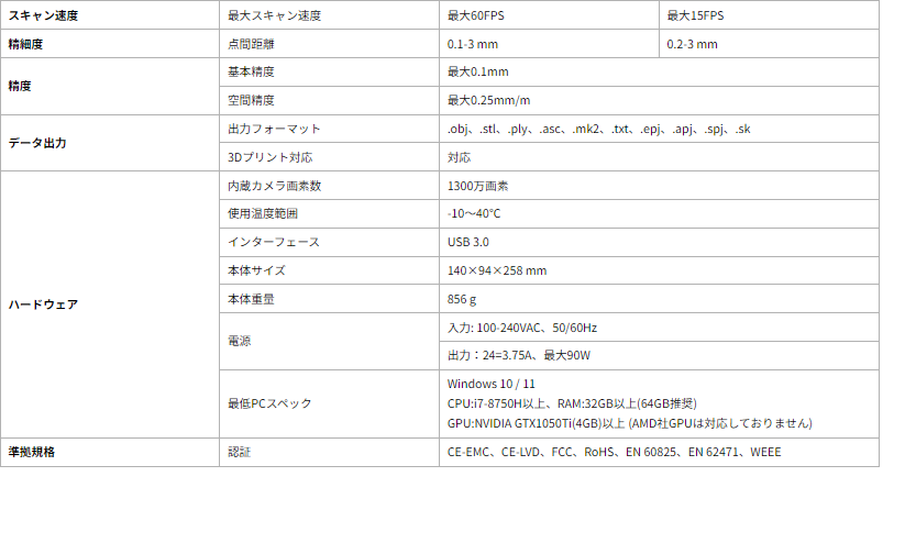 表中のパラメーターは、上記のテスト方法から算出されたものです。SCANTECHの工業用3Dレーザースキャナーは、精度の一貫性に対してより高い要求がある場合や、高精度の3Dスキャナーが必要な場合にご購入ください。