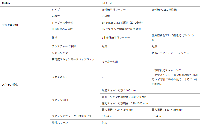 IREAL M3は、赤外線平行レーザーと赤外線VCSEL構造光の2つの光源を採用しています。赤外線平行レーザーは、様々なサイズや素材(黒色や反射を含む)のオブジェクトをスキャンすることが可能です。一方、赤外線VCSEL構造光は、人体や中・大型オブジェクト(30cm以上)のスキャンに適しています。