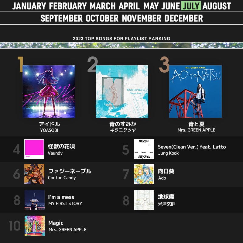 2023年7月度は、TVアニメ『推しの子』オープニングテーマに起用され、米ビルボード・グローバル・チャート“Global Excl. U.S.”にて1位を獲得したことでも話題となったYOASOBIの「アイドル」が4ヵ月連続で1位を獲得。2位には、TVアニメ『呪術廻戦』第2期「懐玉・玉折」オープニングデーマで物語とリンクした歌詞がアニメをさらに盛り上げているキタニタツヤの「青のすみか」、3位には今年結成10周年となるMrs. GREEN APPLEが2018年にリリースした「青と夏」が輝いています。その他にも、BTS Jung kookのソロデビュー曲「Seven(Clean Ver.) feat. Latto」が5位に、宮﨑駿監督映画『君たちはどう生きるか』主題歌の米津玄師「地球儀」が初登場8位にランクインしています。ぜひ、この続きはランキング50位までを発表しているプレイリストでお楽しみください。