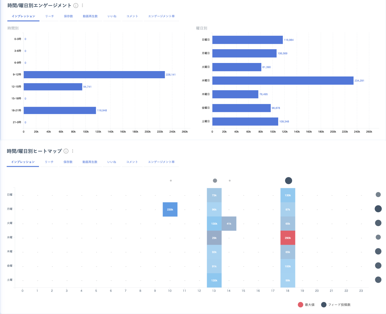 最適なエンゲージメントが得られる投稿のタイミングを分析できます。