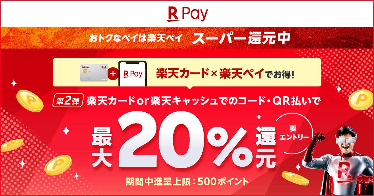 「第2弾 楽天カードもしくは楽天キャッシュでのコード・QR払いで最大20%還元!」 |