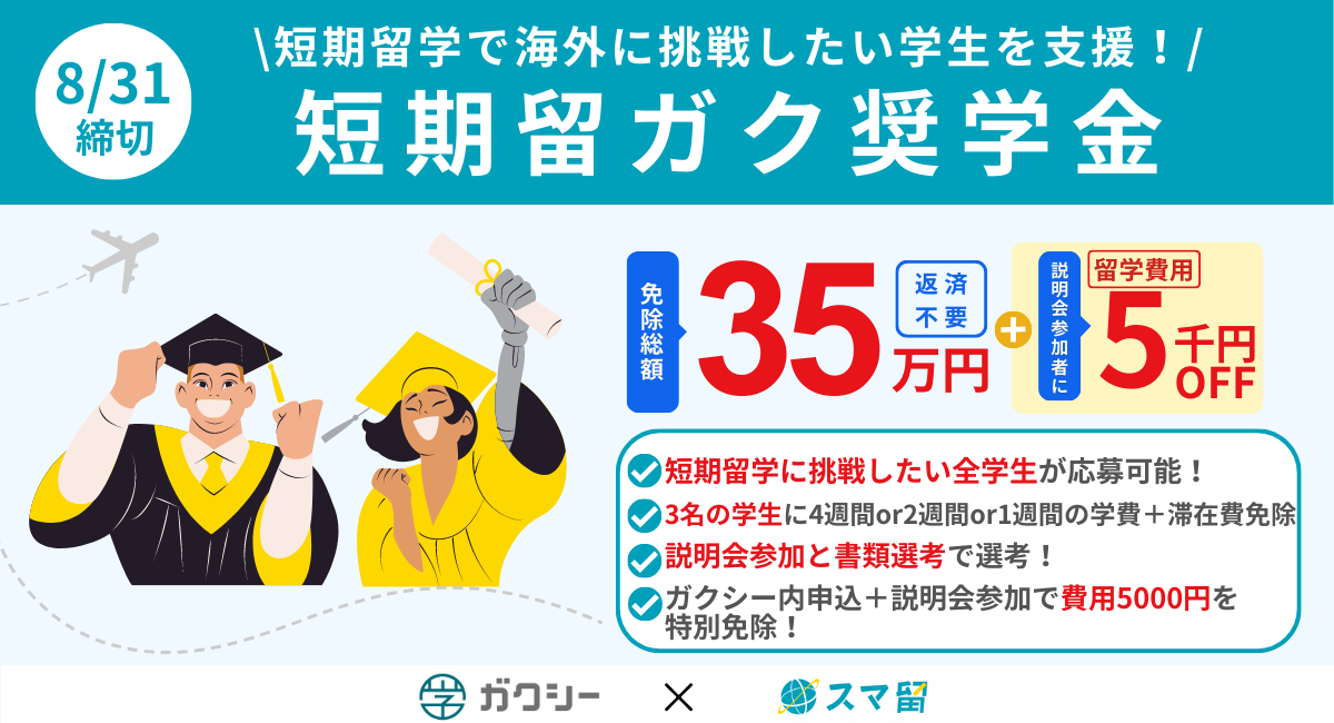 (https://agent.gaxi.jp/)を運営する、株式会社ガクシー(本社:東京都港区、代表取締役:松原良輔)では、経済的な理由で留学に挑戦できない学生を支援するため、海外留学サービス『スマ留』を運営する株式会社リアブロード(本社:東京都渋谷区、代表取締役社長:神田慎)協賛のオリジナル奨学金『【スマ留×ガクシー】短期留ガク奨学金』(以下当奨学金)を設立し、本日から8月31日までの期間、奨学金情報サイト『ガクシー』にて申し込みを受け付けます。