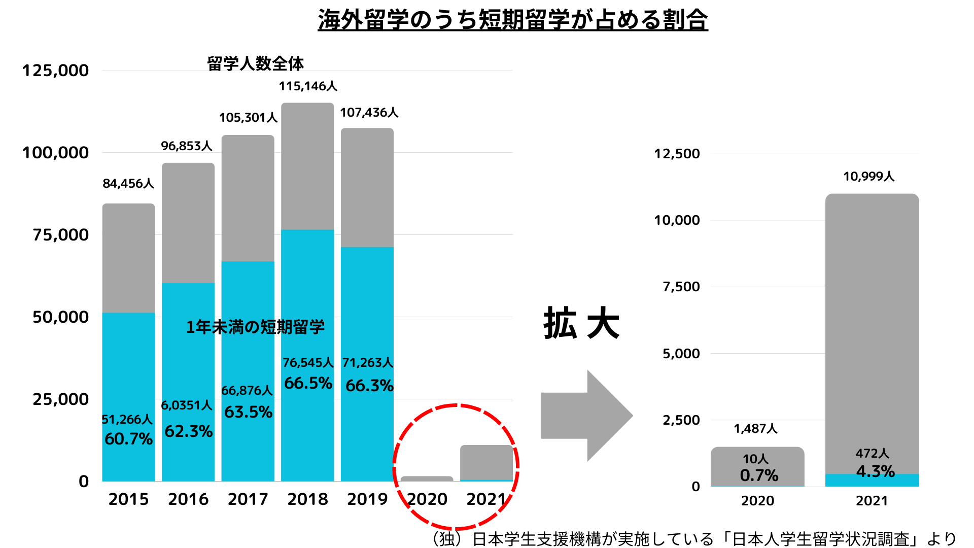 (独)日本学生支援機構が実施している「日本人学生留学状況調査」によると、大学等が把握している日本人学生の海外留学状況は、2019年まで年々増加し、そのうち全体の6割以上を1年未満の短期留学が占めていました。しかし、2020年以降のコロナ禍の影響もあり、留学者数は大幅に落ち込み、現在全体の留学人数は緩やかな回復基調に留まっています。しかしながら、短期留学の割合は2021年は留学全体の5%以下と、大きく低迷している状態が続いています。語学力向上のため学位取得を目的としない短期留学は、現在のインフレや円高などの影響もあり、経済的な理由で諦める学生も多くいることが推察されます。