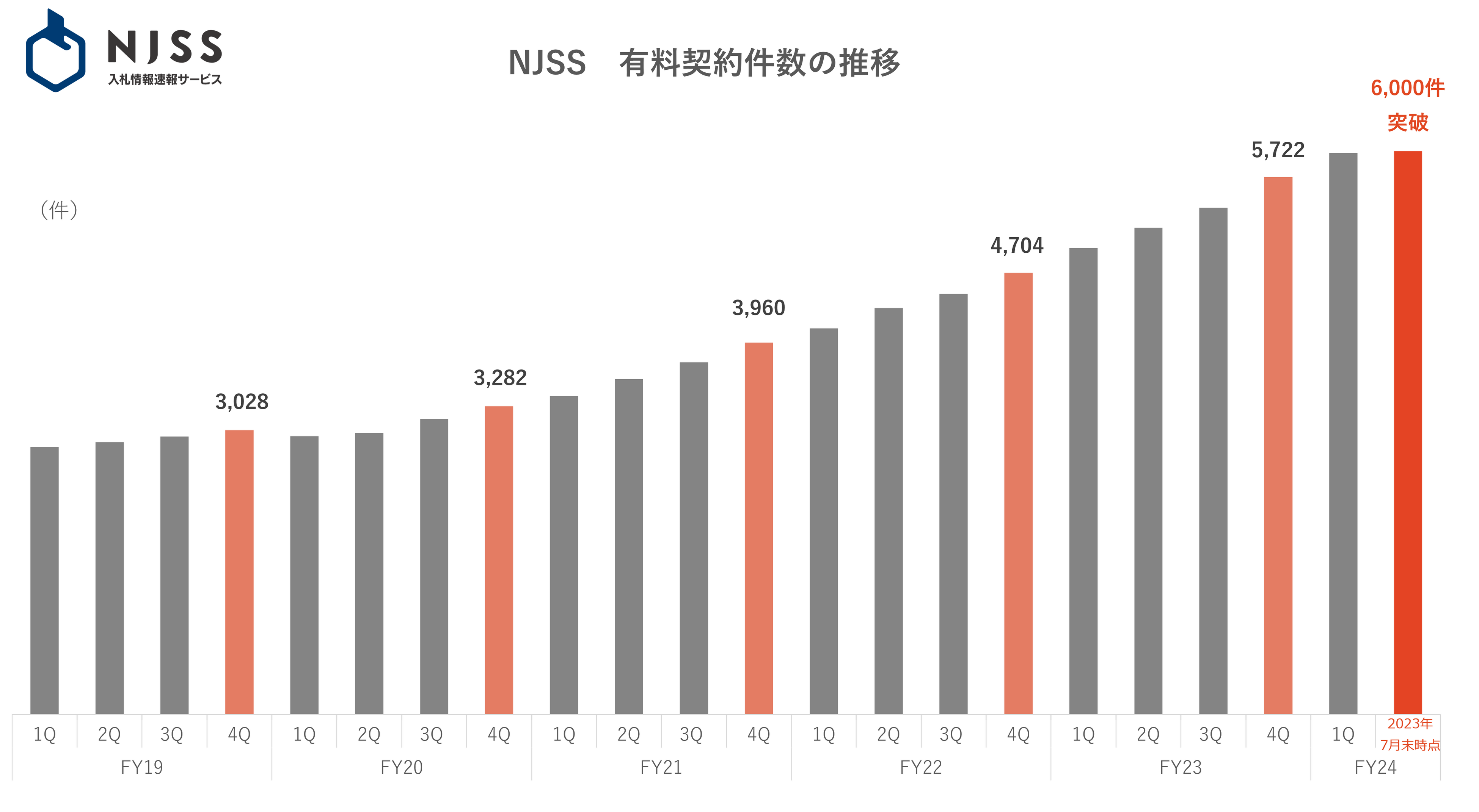 そしてこの度、2023年7月末時点で、有料契約件数が6,000件を突破いたしました。前回の5,000件突破からわずか1年で有料契約件数が1,000件以上純増し、年々増加ペースが早まっております。またアフターコロナで民間需要が回復している中でも、「NJSS」の無料トライアル件数が順調に増加していることから、入札に対する民間企業からの需要の高まりとともに、「NJSS」の認知度およびサービスのニーズも拡大していると考えられます。