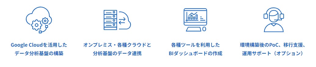 Google Cloudを活用したデータ分析基盤の構築や、オンプレミス・各種クラウドと分析基盤のデータ連携をサポートします。