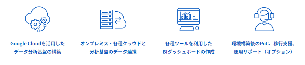 Google Cloudを活用したデータ分析基盤の構築や、オンプレミス・各種クラウドと分析基盤のデータ連携をサポートします。