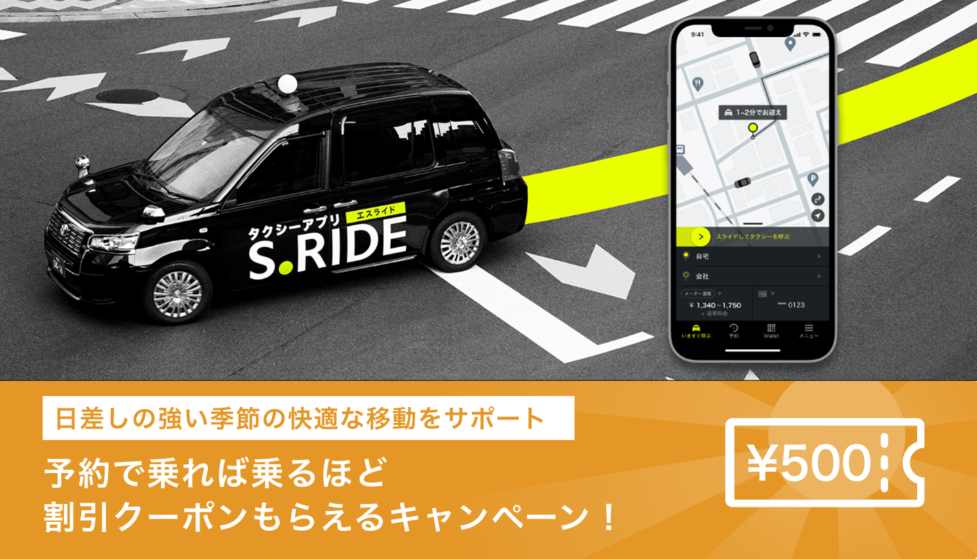 ・キャンペーン期間に、S.RIDEにて予約配車で3回乗車毎に割引クーポン500円分を1枚、プレゼントします。