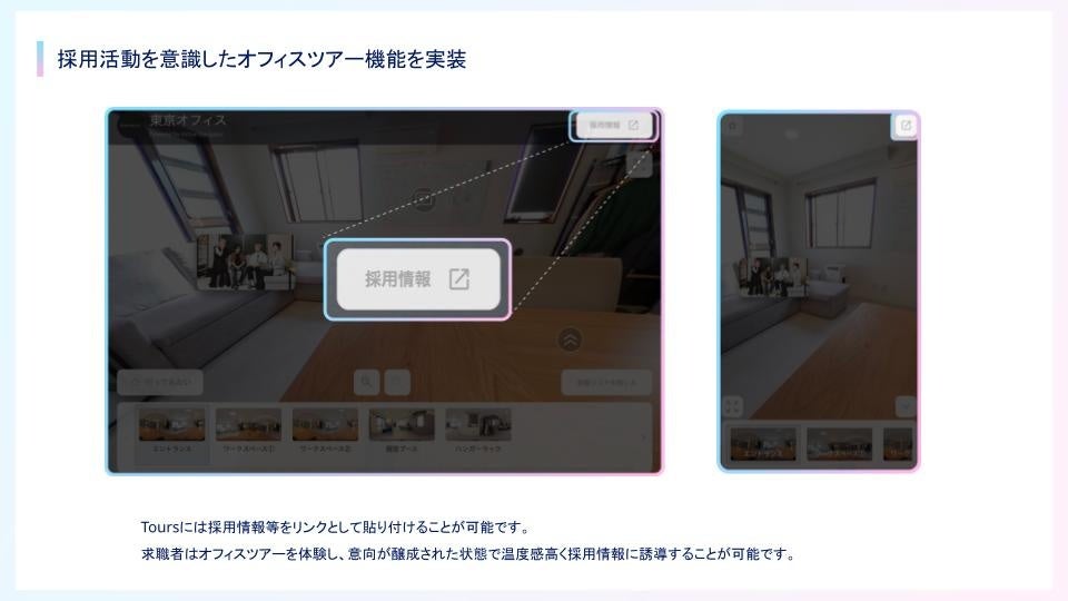 「バチャナビ – Tours」は360度パノラマビューを利⽤したバーチャルオフィスツアーツールです。⾃社のこだわり溢れるオフィスを求職者や採⽤パートナー企業、そのほかステークホルダーに届けることができます。
