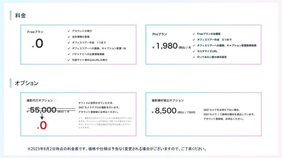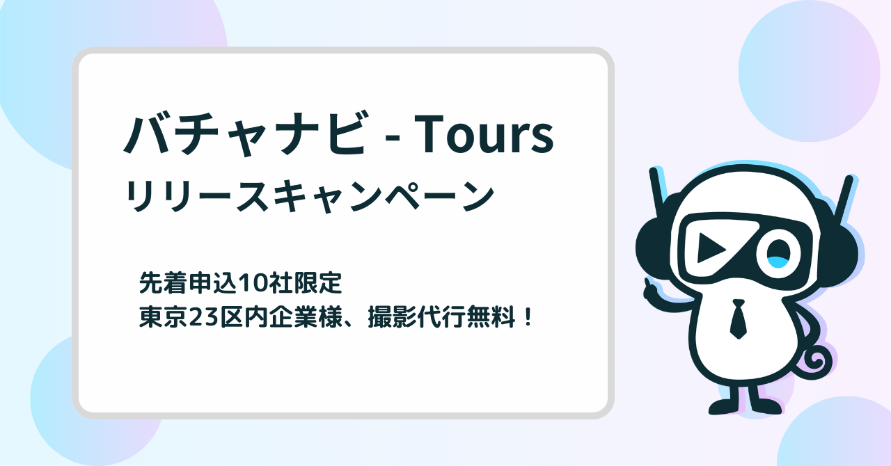 「バチャナビ – Tours」の提供開始を記念して、、東京23区内で先着申し込みの企業様を対象に撮影代行が無料となるキャンペーンを開催しております。詳細については、以下のメールアドレスへお問い合わせください。