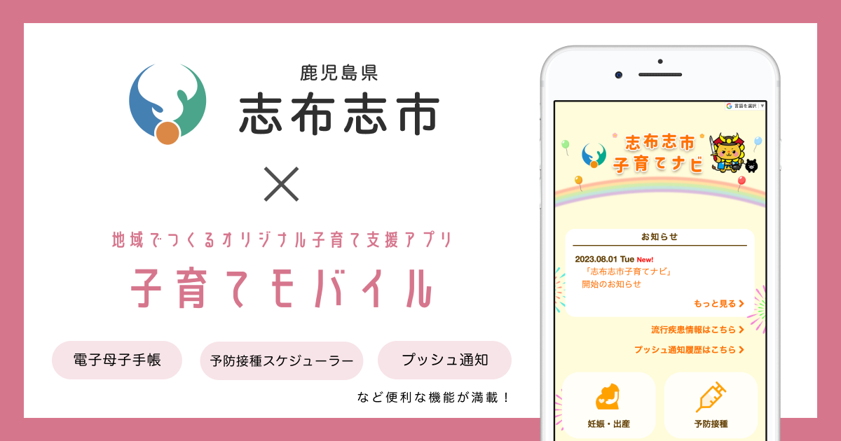 ライフスタイルの多様化による子育て世代のニーズの変化に伴い、一人一人の状況に合わせた子育て情報の発信やプッシュ通知、簡便な予防接種スケジュールツールを提供するため、鹿児島県内でも取り入れられている 子育て支援アプリ「子育てモバイル」を導入する運びとなりました。志布志市オリジナルのデザインを施し、子育て支援アプリ「志布志市子育てナビ」として提供いたします。