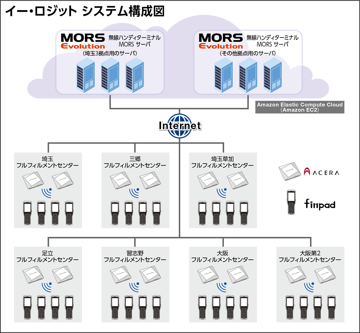 finpadの導入台数は7拠点で合計800台以上になります。フルフィルメントセンター内の広大な空間で、多台数のfinpadを一斉に稼働させるための通信基盤を、フルノシステムズの業務用無線LANアクセスポイント「ACERA(アセラ)」を設置することで構築しています。