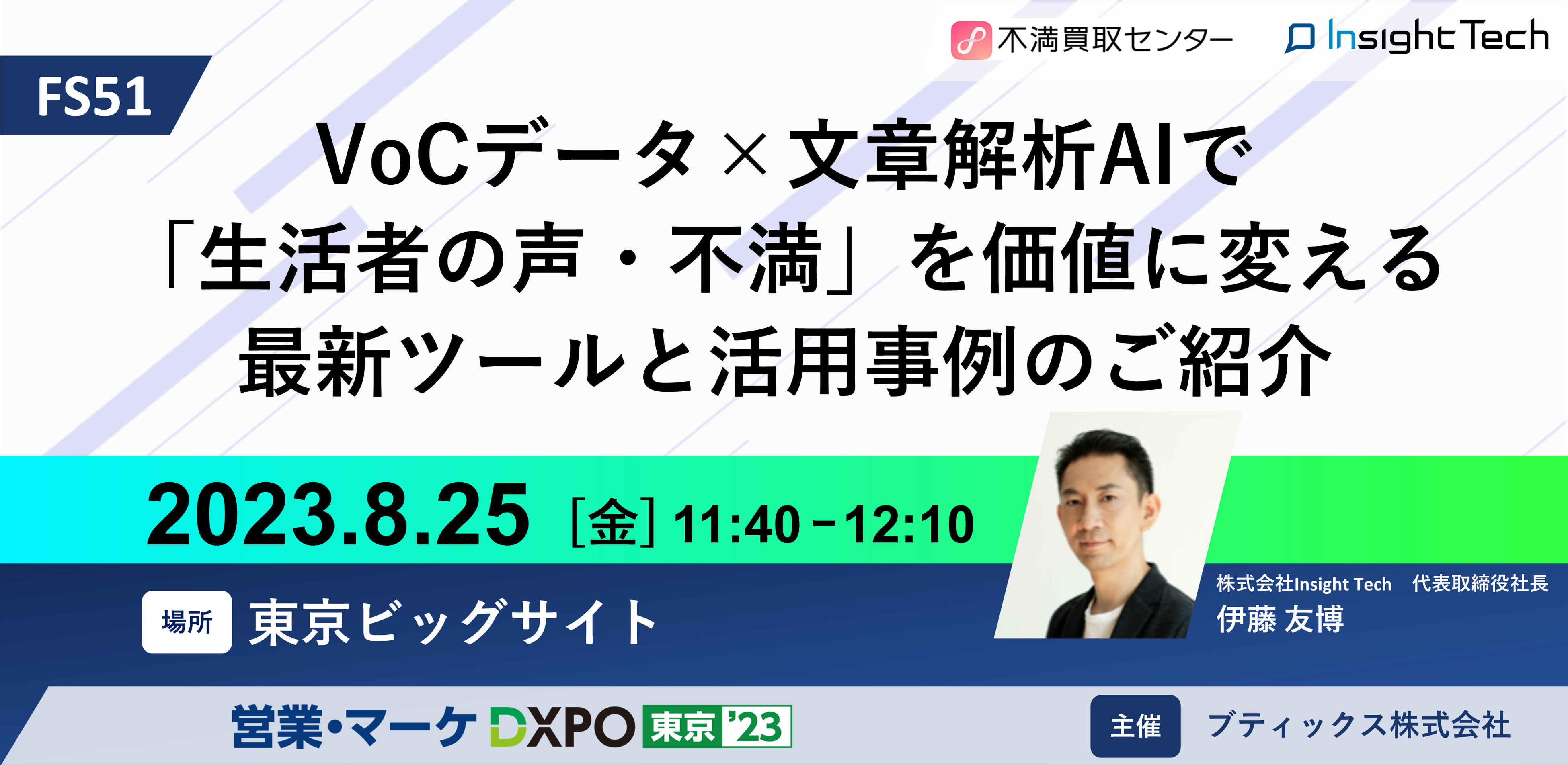 「データマーケティング」の重要性が高まる中、Insight Techは「生活者の声・不満」を活かした新しいマーケティングツールとして、「不満ファインダー」「アイタスクラウド」を展示・ご紹介します。