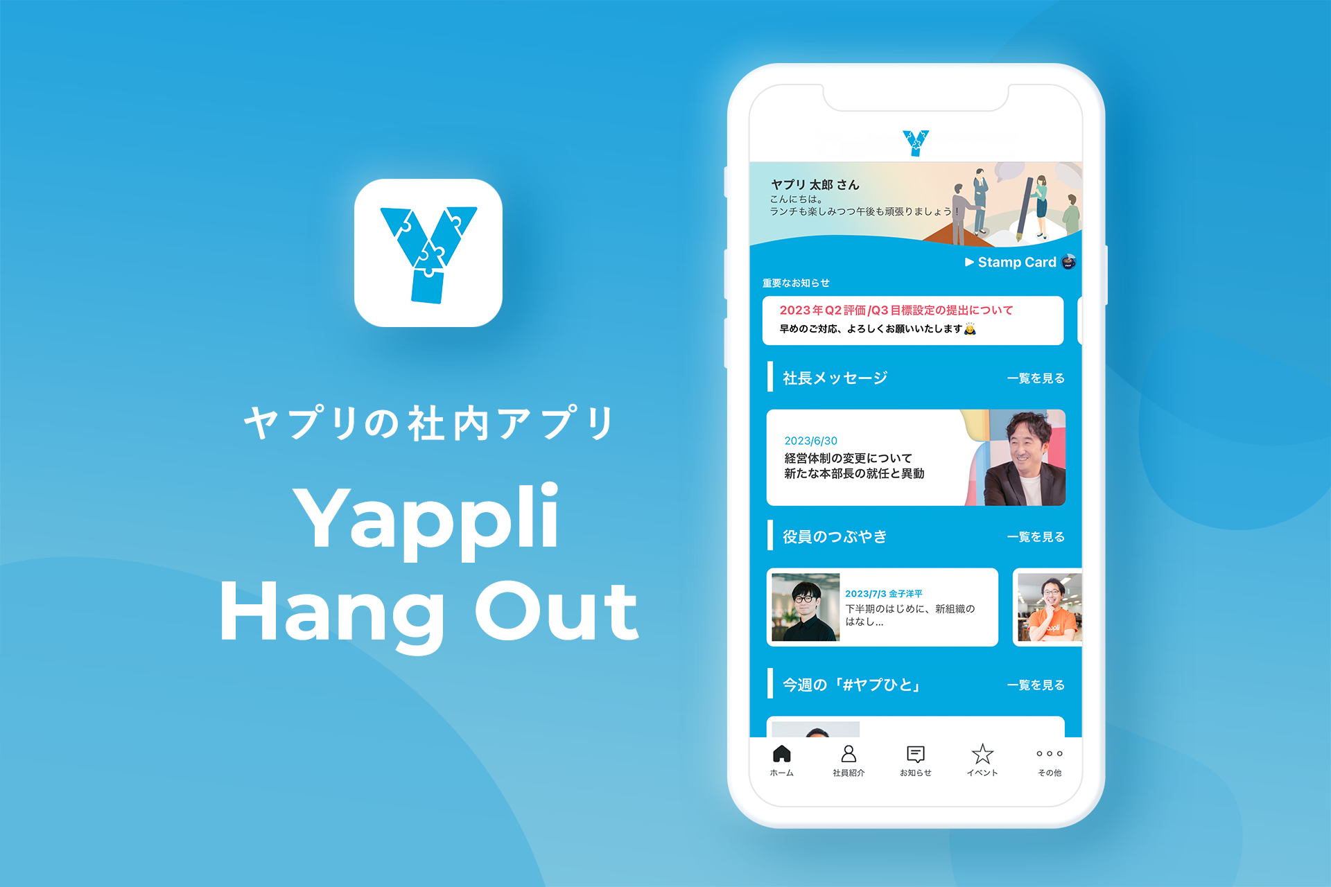 社員同士の繋がりを強化しカルチャーをより大切にする組織へと成長するために、会社と社員が平等に情報を共有でき、組織エンゲージメントを高めるために様々な施策を展開する社内アプリ「Yappli Hang Out」の運用を開始しました。