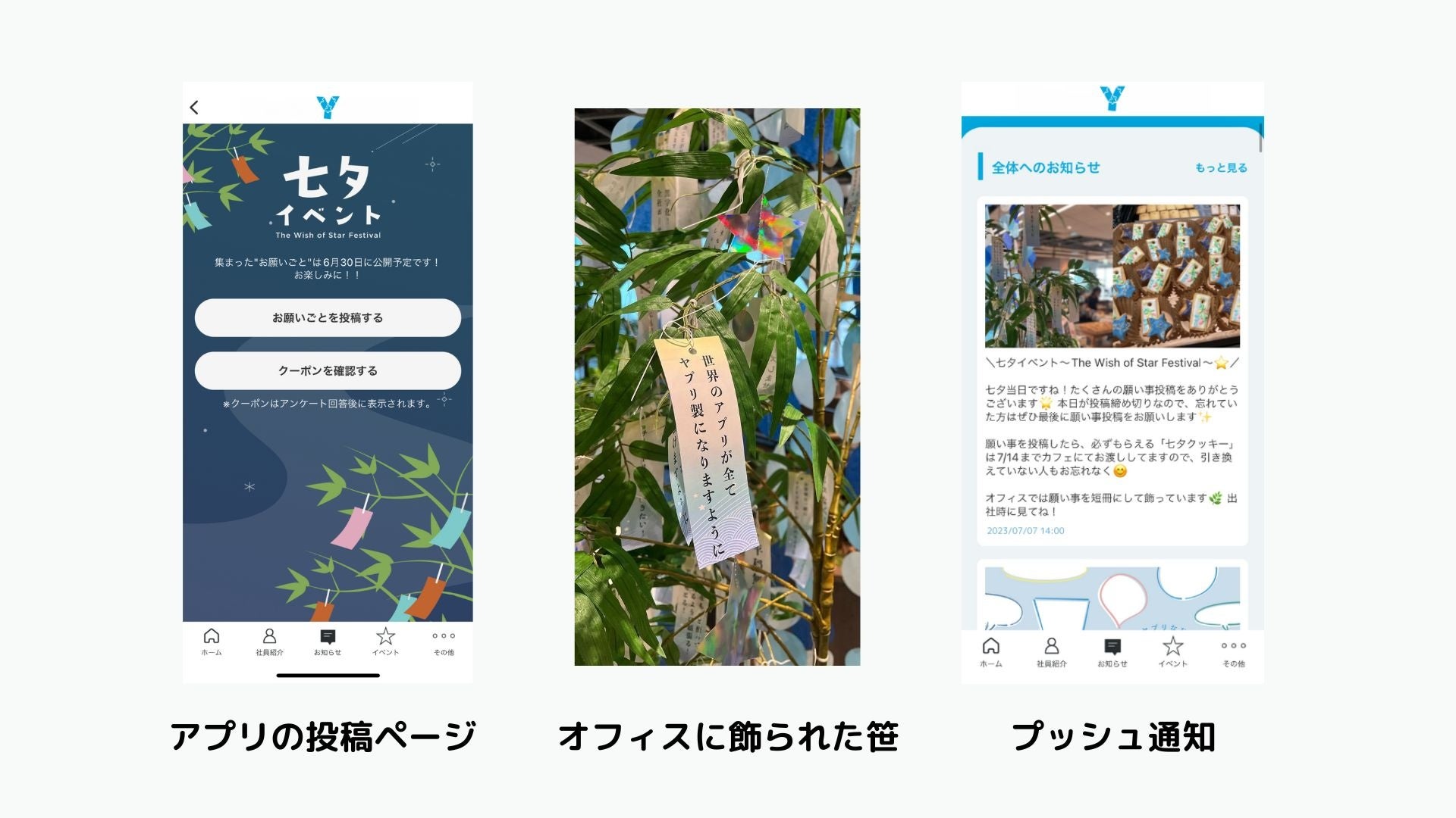 季節のイベントでは、アプリ内で「七夕のお願いごと」を投稿すると、アプリ上でもオフィスエントランス(オフライン)でもメンバーの願いごとが見れる仕掛けで、他メンバーへの興味喚起や会話のきっかけを提供しました。