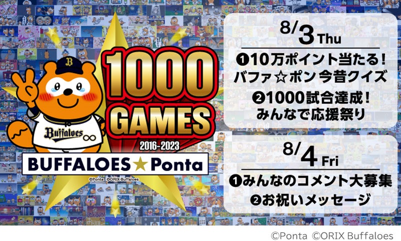 1000試合目を達成する8月3日(木)は、「バファ☆ポン今昔クイズ 30万Pontaポイントプレゼントキャンペーン」を開催します。バファローズ☆ポンタ公式Twitter(@bs_ponta:https://twitter.com/bs_ponta)をフォローの上、期間中にハッシュタグ「#バファポン今昔クイズ」を付けてクイズに答えた方から、抽選で3名様に各10万Pontaポイントをプレゼントします。また、当日の試合中には、「1000試合達成!みんなで応援祭り」として、ファンの皆様にTwitterでの応援を楽しんでいただける施策をご用意しています。