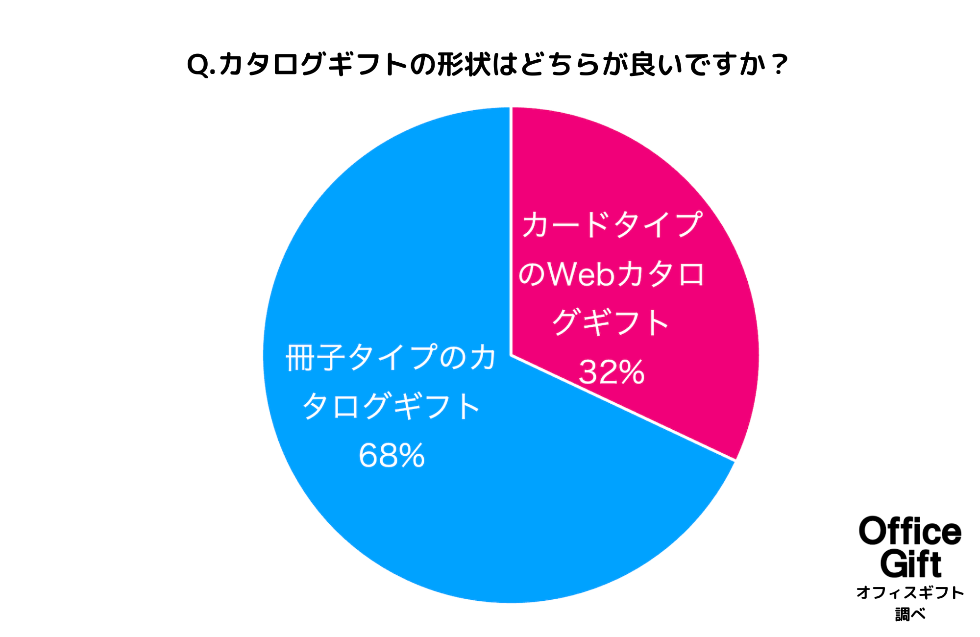 「カタログギフトの形状はどちらが良いですか?」という設問に対し、32%が「カードタイプのWebカタログギフト」、68%が「冊子タイプのカタログギフト」を選択する結果になりました。