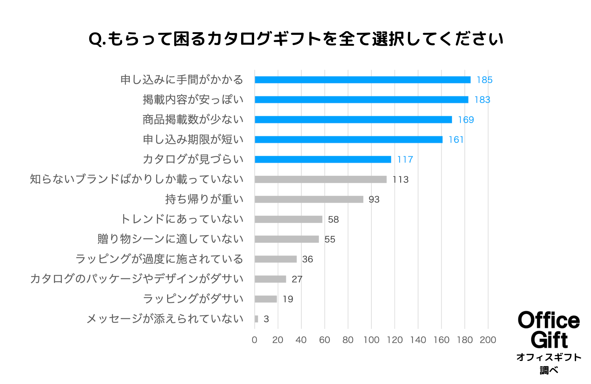 「もらって困るカタログギフトを全て選択してください」という設問に対しては、「申し込みに手間がかかる」が最も票数を集める結果になりました。