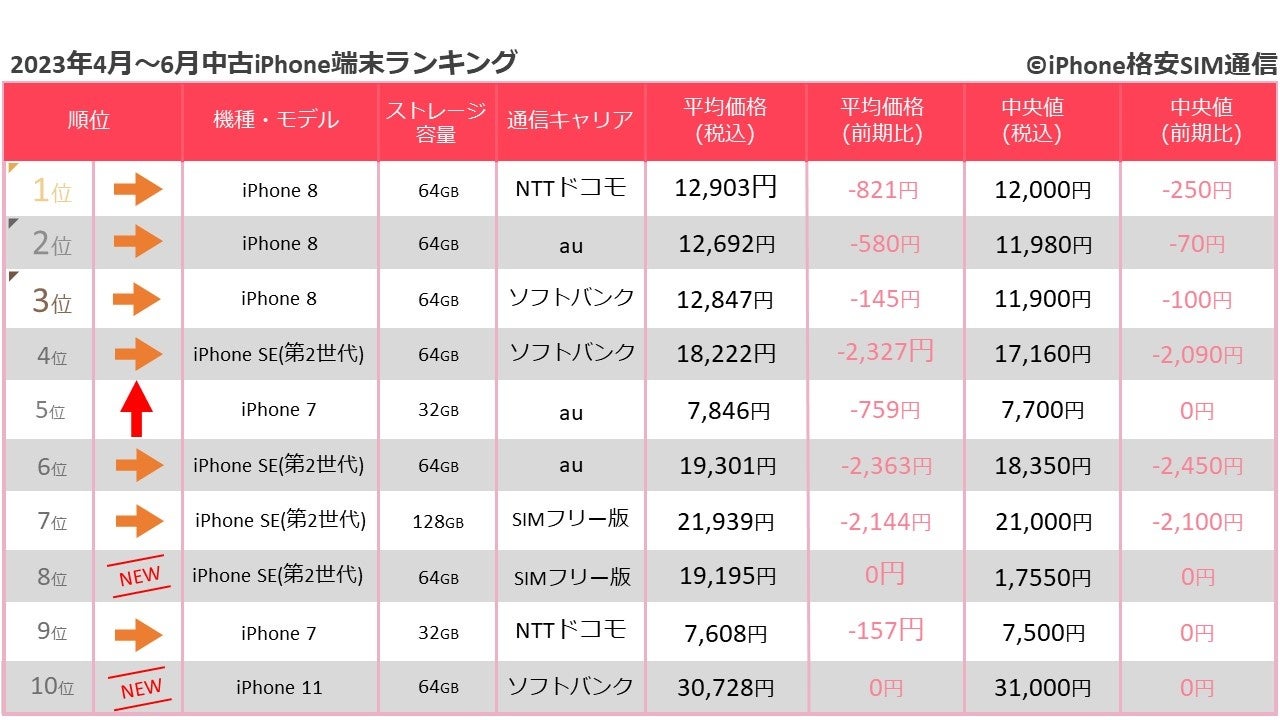 今回の調査では、前回の調査で9位だったiPad Air2(au)が1位へと大きく順位を伸ばしました。取引数は、前回48件から今回の559件とおよそ12倍もの伸びを見せています。iPad Air2は、8年前に発売された決して新しくはないモデルですが、高画質なディスプレイと高性能カメラを搭載しており、現在でも充分に使えるスペックが支持されています。今回の調査で、取引数急増の背景には、auで4月末から6月末の間に実施された割引キャンペーンの存在が挙げられます。このキャンペーンを利用して新しいiPadを購入したことで、中古市場にiPad Air2(au)が多く流通し、中古市場の取引数増加につながったと言えるでしょう。