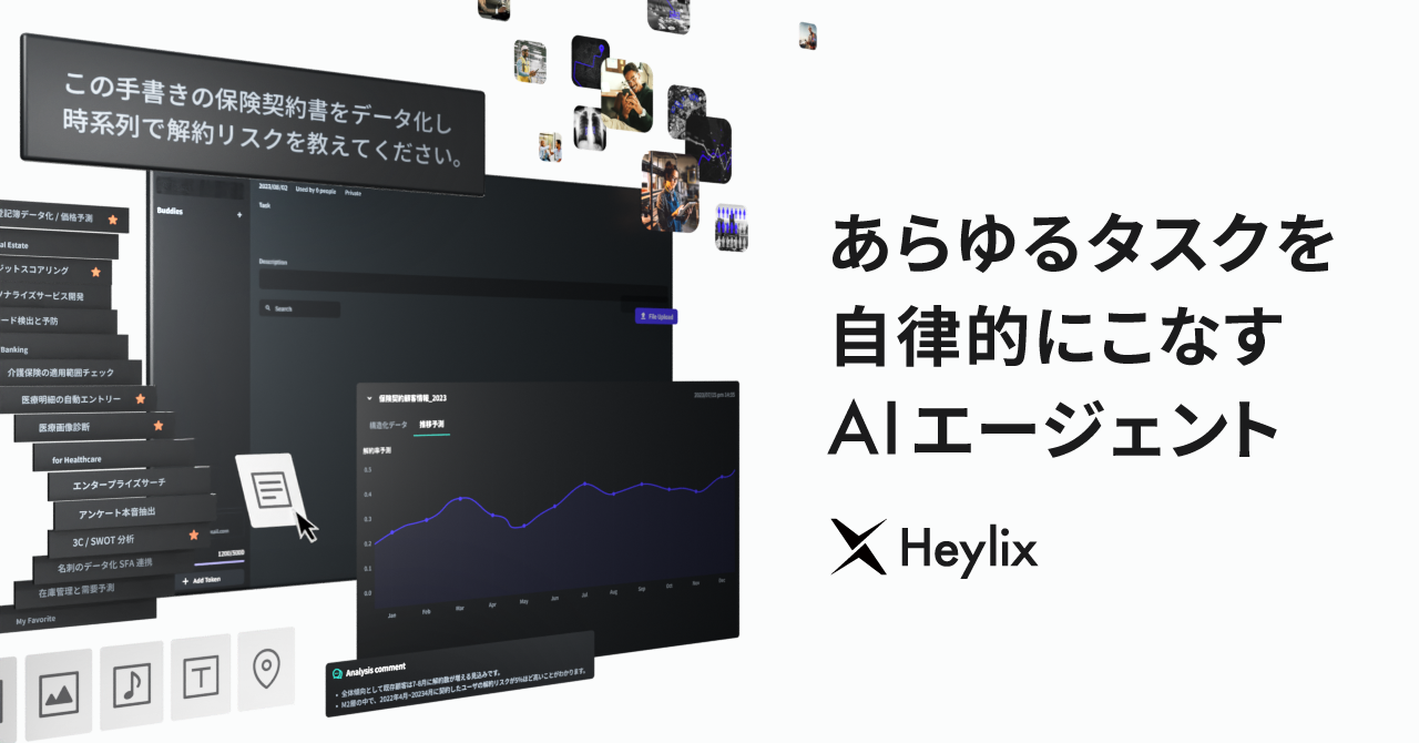 「Heylix」は、業界・業種を問わずあらゆる業務を汎用的に支援するAIエージェントです。ユーザは「Heylix」に指示を出すだけで、「Heylix」がマルチモーダルかつ自律的にタスクをこなしてくれる“Buddy(バディ)”を生成します。ユーザは“Buddy”の支援により、高度なDXを実現することができます。