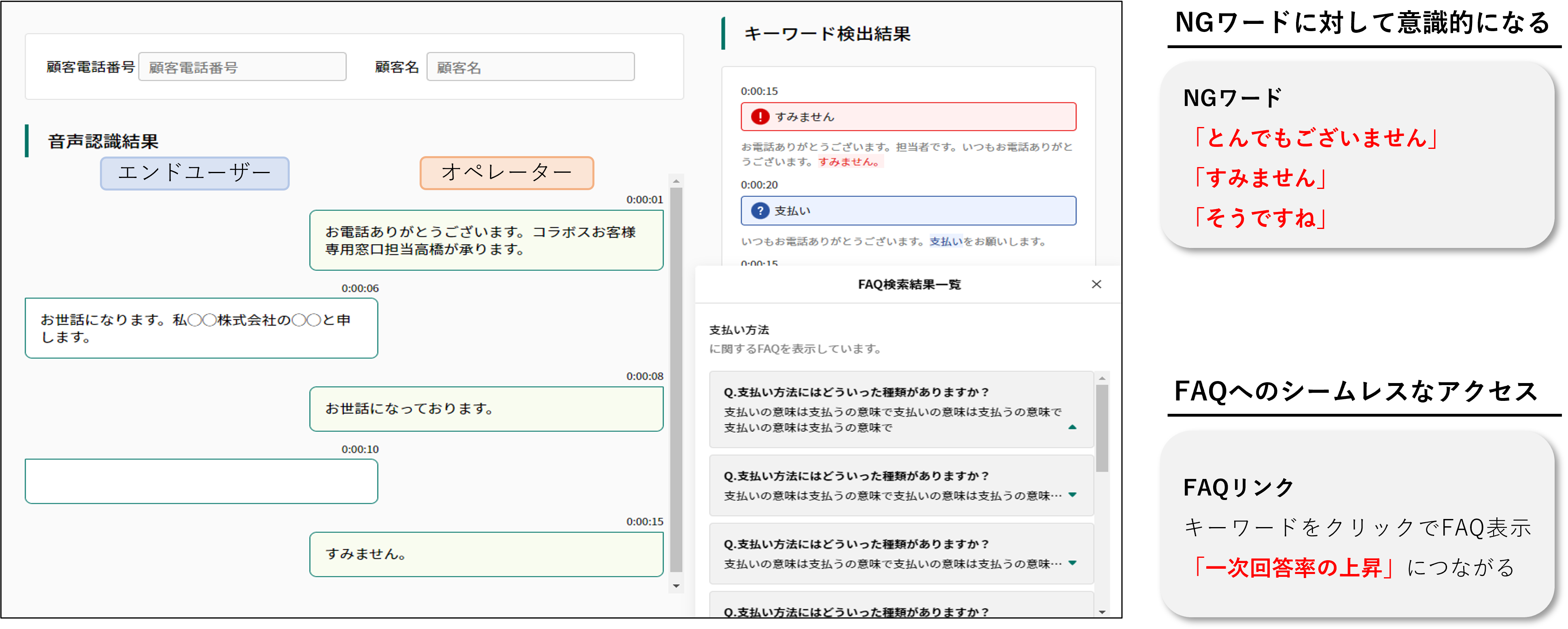 以下の画面表示例のように、音声認識機能により、顧客とオペレーターの通話をリアルタイムでテキスト表示することができます。また、キーワード検出機能により、オペレーターのNGワードへの認識を促すことができます。さらに、キーワードをワンクリックすることで、FAQが自動表示されるため、顧客への回答がタイムリーかつ均一化されます。