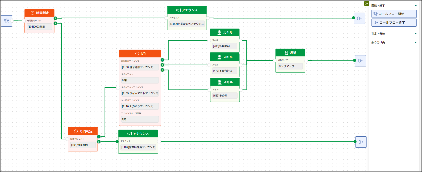 GUIは、グラフィカル ユーザー インターフェースの略であり、使いやすさを重視し、画面上でアイコンやボタンなどを用いて、視覚的・直感的にわかりやすくコンピューターに指令を出せるようにしたユーザーインターフェースです。以下の図のように、オブジェクトを線で繋ぐだけで、簡単に顧客からの入電を一定のルールに基づき振り分けるコールフローを作成できます。