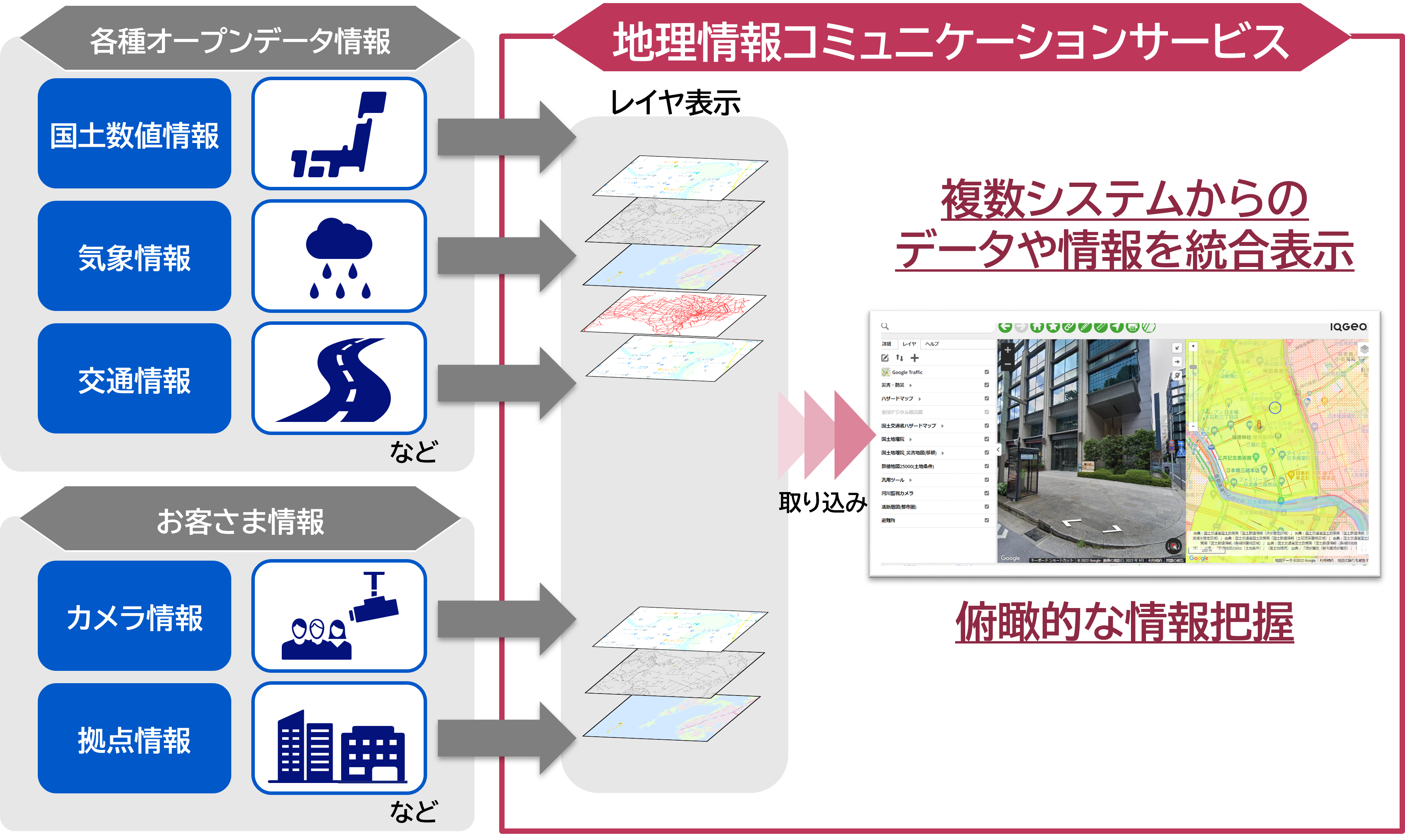 NECネッツエスアイがこのたび提供する「地理情報コミュニケーションサービス」では、お客さまがお持ちの拠点や設備の情報に加え、気象情報、交通情報、被災情報など各種web上で公開されているデータを地図上で統合表示し、利用者の用途に応じて自由に重ね合わせて確認することができます。